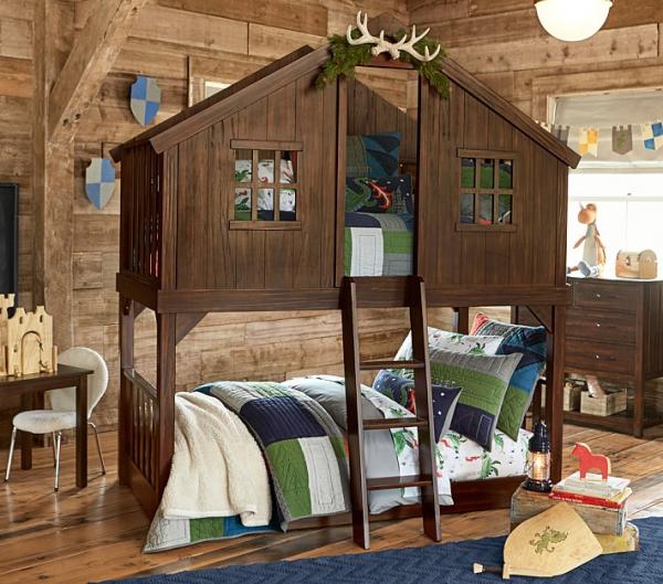 Mẫu giường tầng gỗ độc đáo, với thiết kế như hình một ngôi nhà cùng với đó mà màu sắc mang nét đặc trưng của gỗ, khiến giường ngủ của bạn như một ngôi nhà giữa chốn rừng xanh đầy thoáng đãng và trong lành, tươi xanh.