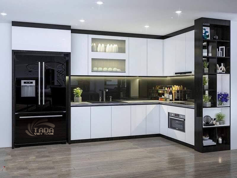 Bộ tủ bếp chữ L nhà anh Quang tông màu đen - cánh trắng kết hợp ốp bếp đá xanh nhạt, phong cách hiện đại, các công năng được bài trí thông minh