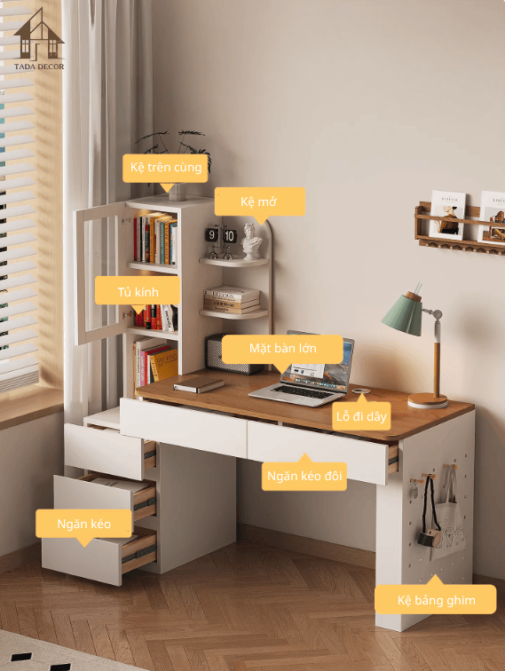 Khi kết hợp cùng đèn bàn, tranh treo, cây xanh hoặc các vật dụng trang trí, bàn không chỉ là nơi học tập mà còn là nơi truyền cảm hứng.