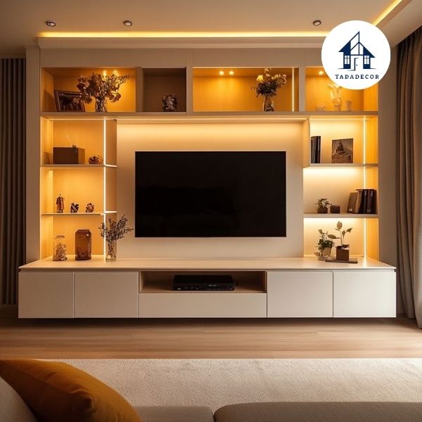 Ví dụ: Kệ tivi treo tường với đèn LED trắng ấm kết hợp tường sơn xám nhạt tạo cảm giác sang trọng.
