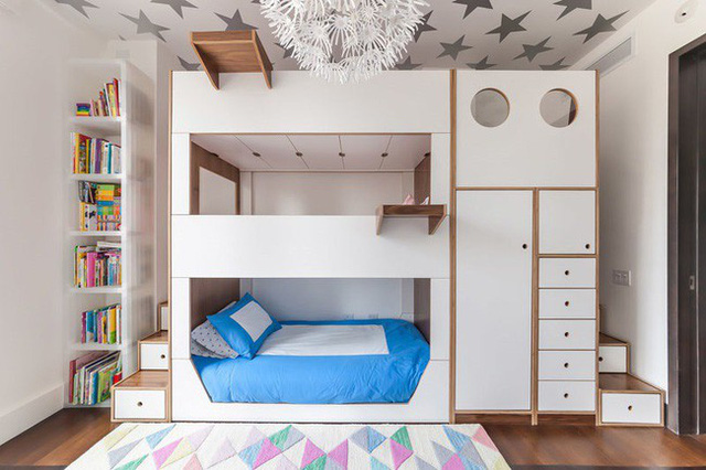 Một chiếc giường tầng kết hợp với tủ quần áo khiến cho gian phòng của bạn sẽ không trở nên quá lộn xộn khi mà giường và tủ đã được tích hợp với nhau, tạo cho gian phòng của bạn cảm giác gọn gàng và ngăn nắp cũng như thêm được nhiều diện tích cho việc sinh hoạt cá nhân hơn. Với màu trắng trang nhã kết hợp với gam màu lạnh- màu chủ đạo của ngôi nhà kết hợp với nhau đã tạo nên được sự hiện đại trong thiết kế cũng như sự tiện ích cho người sử dụng.