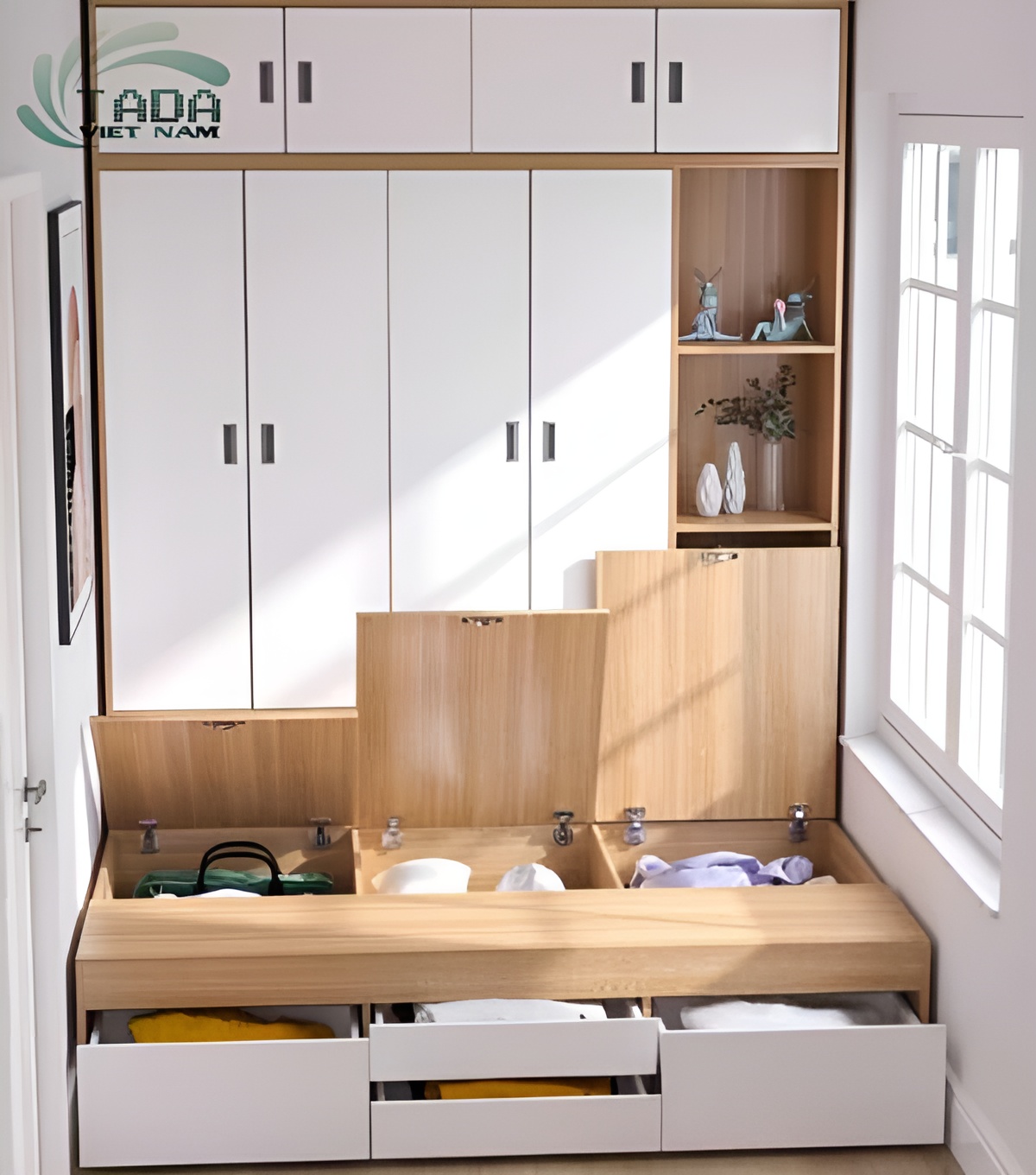 Các mẫu giường liền tủ có tủ áo tích hợp cung cấp không gian lưu trữ rộng rãi cho quần áo và phụ kiện cá nhân. Theo đó, mẫu giường kết hợp tủ này sẽ giúp bạn duy trì sự gọn gàng trong phòng ngủ và tiết kiệm diện tích đáng kể hơn so với việc sử dụng tủ áo riêng biệt.