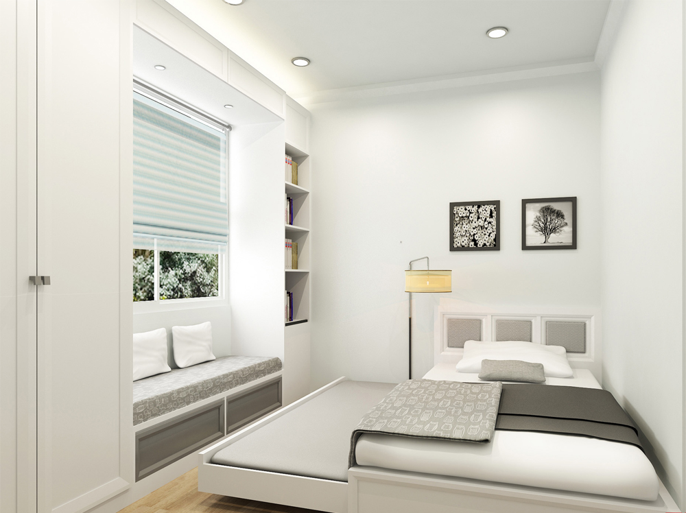 Còn đối với chỗ thang lên tầng lửng bạn nên dùng loại có các bậc gỗ sáng màu kèm lan can kính nhằm tiết kiệm diện tích đồng thời tăng giá trị thẩm mỹ, đồng điệu với nội thất của ngôi nhà. Dưới cầu thang có thể bố trí một phòng vệ sinh nhỏ gọn. Tầng lửng sẽ được thiết kế thành phòng ngủ nhỏ xinh cùng với chiếc bàn trang điểm kết hợp bàn làm việc, bên cạnh đó đừng bỏ qua chiếc tủ kê sát tường. Nếu như các bạn có con nhỏ thì bên cạnh đầu giường sẽ đặt một chiếc nôi xinh xắn cùng bộ kệ gỗ treo tường đặt một số đồ trang trí để tạo không gian ấm cúng.