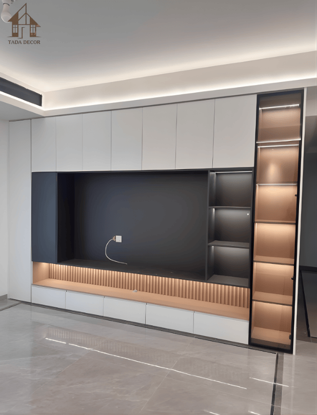 Combo kệ tivi kết hợp hệ tủ trưng bày và tủ lưu trữ của TADA DECOR là một trong những thiết kế tiêu biểu cho xu hướng này. Không chỉ dừng lại ở việc “đặt đồ”, sản phẩm mang đến một tổng thể hoàn chỉnh, giúp không gian phòng khách trở nên sang trọng, gọn gàng và có chiều sâu rõ rệt.
