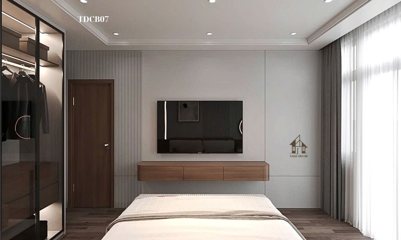 Sau khi được tư vấn, chị Mai đã chọn combo TDCB07 gồm giường ngủ hiện đại, tủ quần áo cánh kính, bàn trang điểm, và kệ tivi treo tường – tất cả đều được đồng bộ về màu sắc, chất liệu và phong cách thiết kế.
