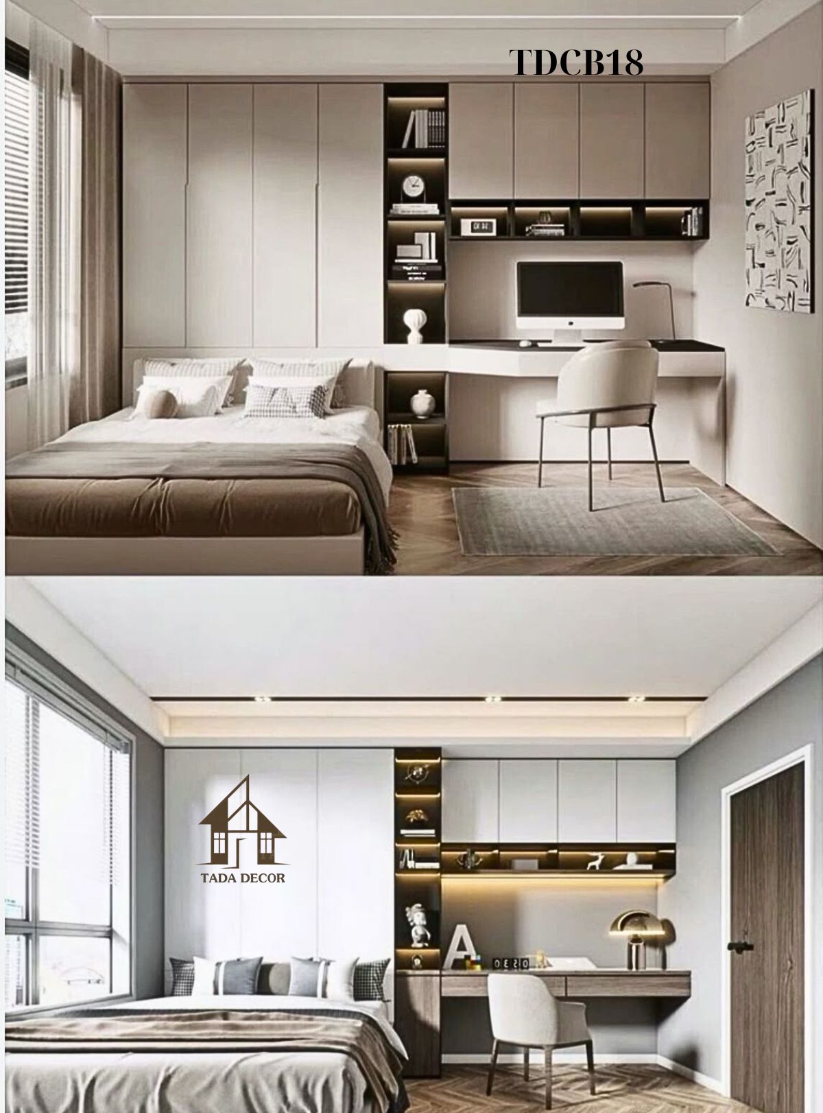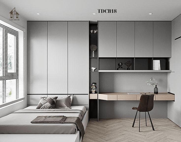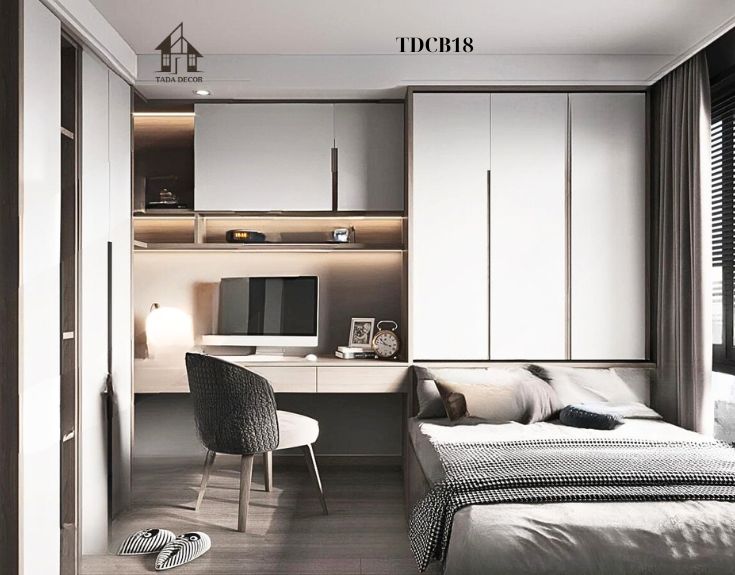 Một ưu điểm khác của combo TDCB18 là sự kết hợp giữa tủ treo tường và bàn học, mang lại không gian làm việc – học tập lý tưởng ngay trong phòng ngủ.