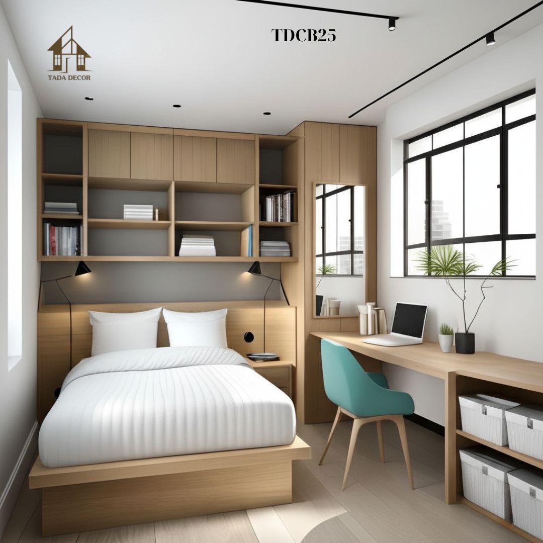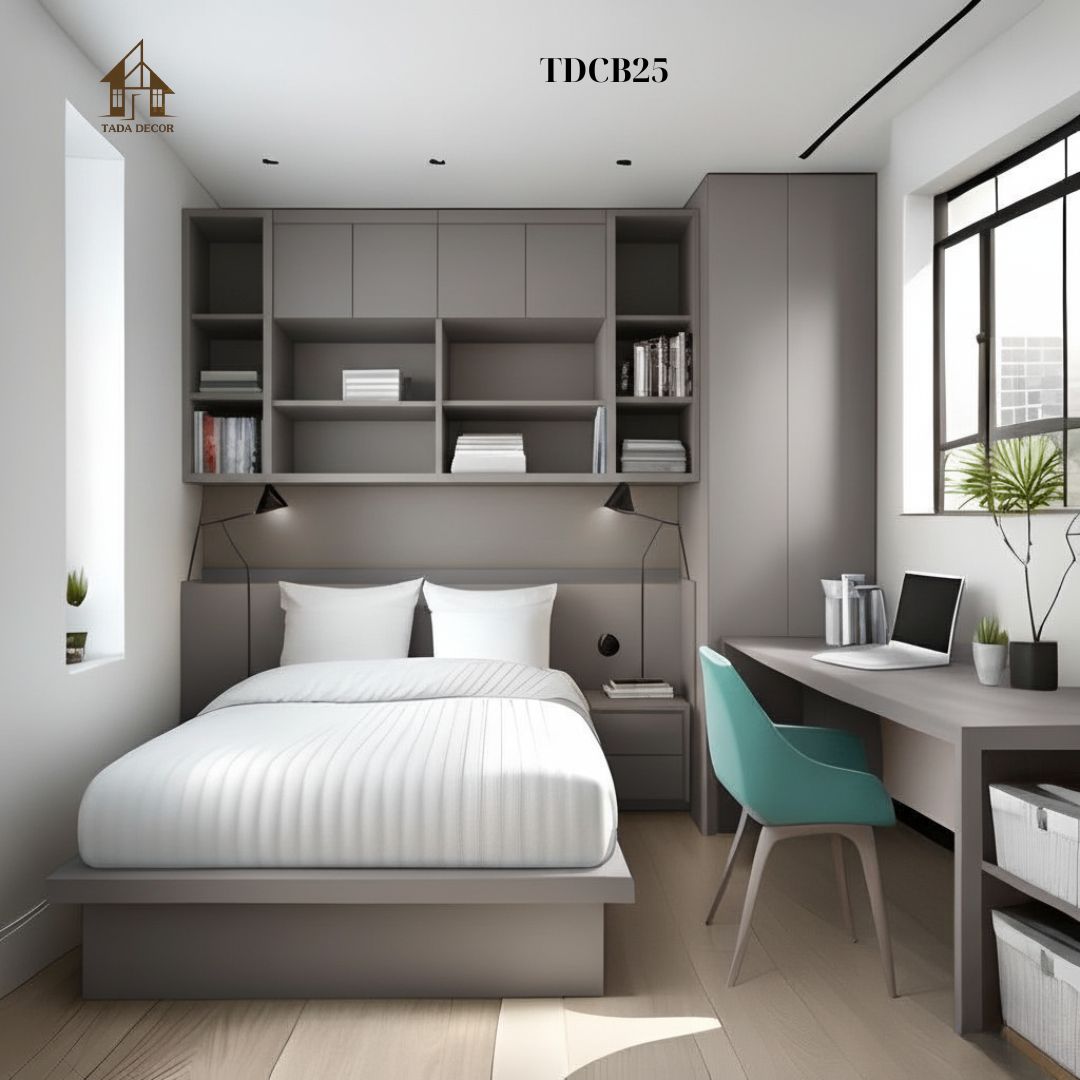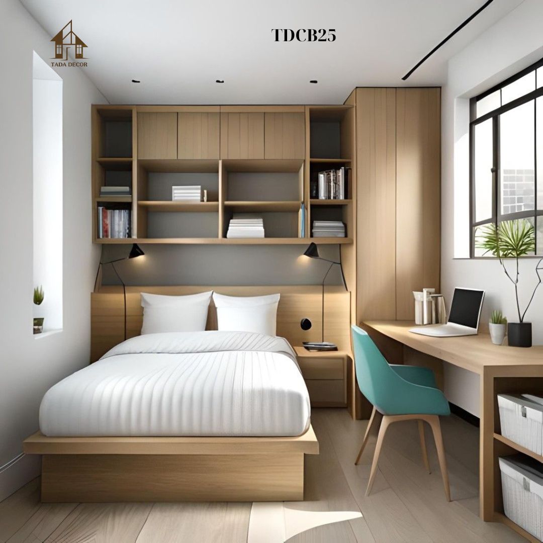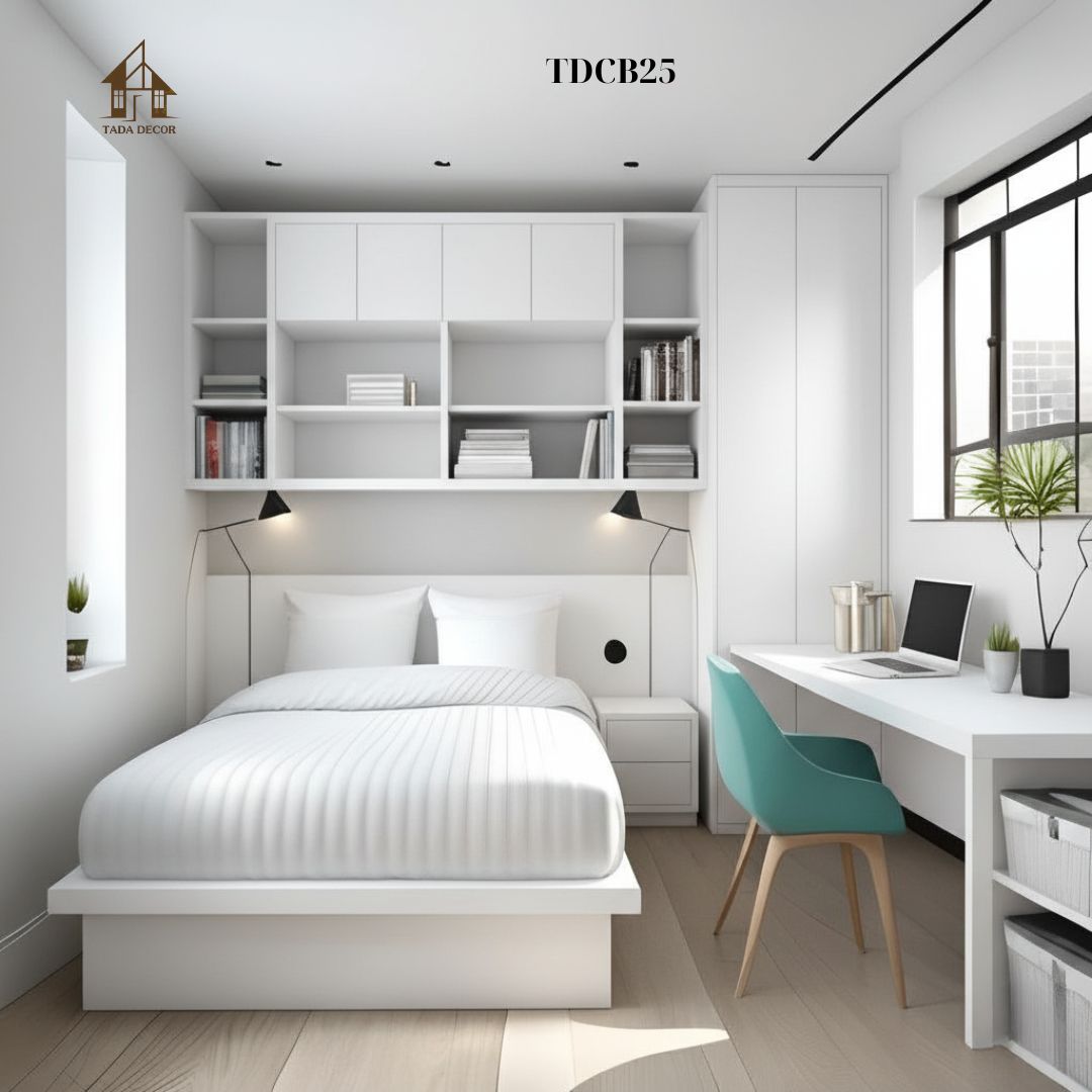 Combo TDCB25 bao gồm giường ngủ, tủ quần áo, bàn học và kệ đựng sách – tất cả đều được thiết kế theo phong cách tối giản, tinh tế, dễ dàng hòa hợp với mọi kiểu không gian từ căn hộ nhỏ đến nhà phố.