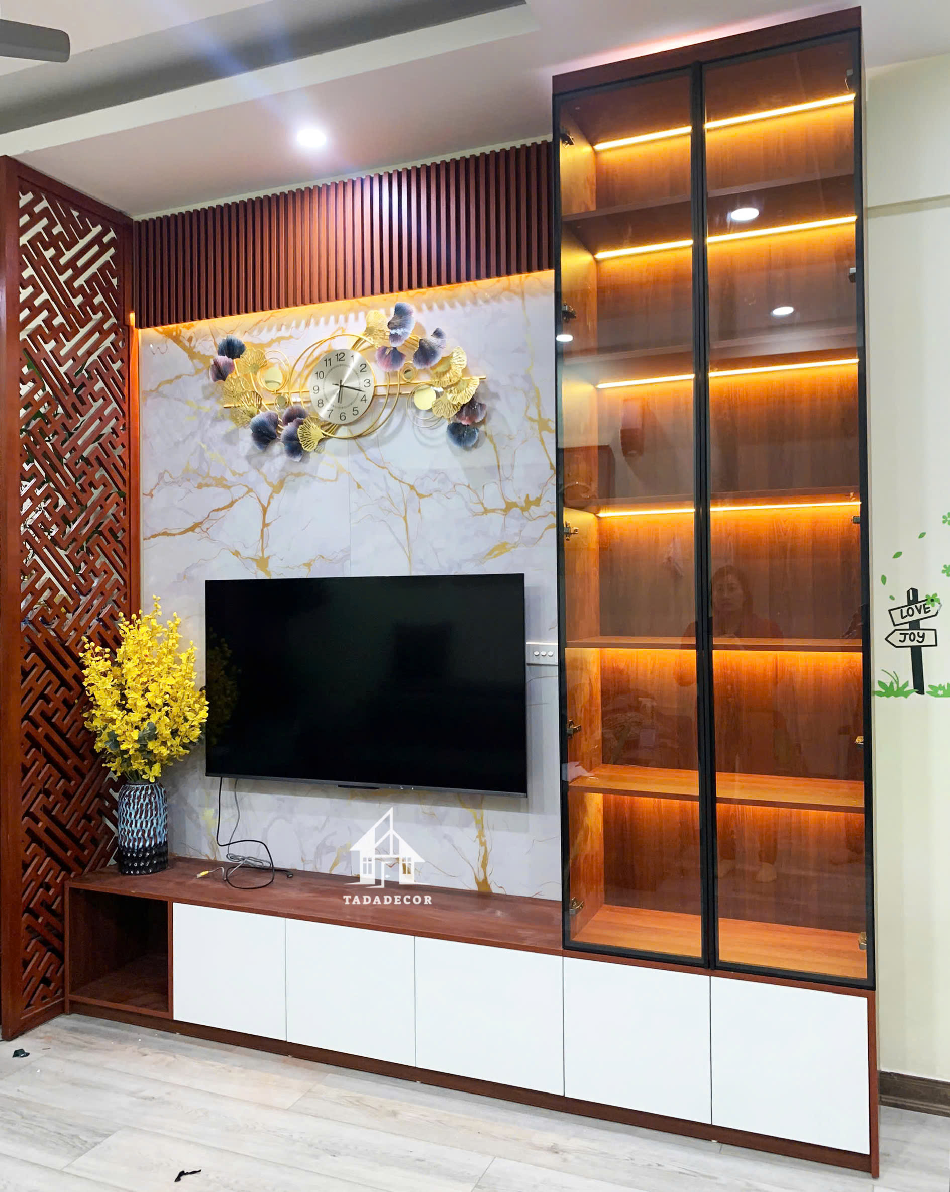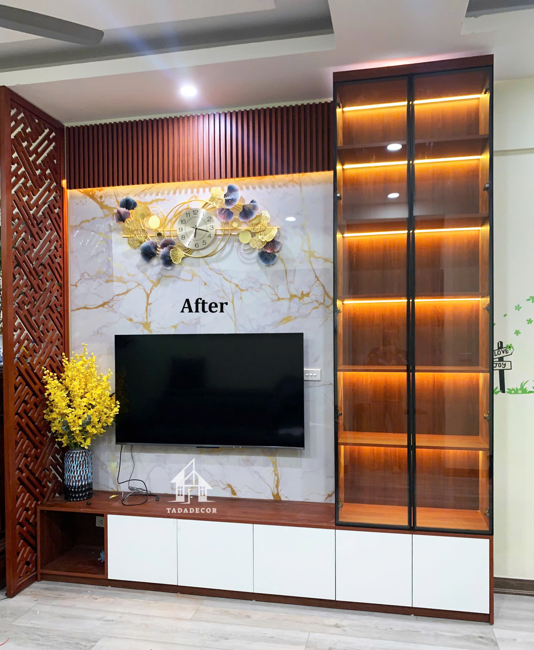 Anh Quyền lần này đã tin tưởng lựa chọn combo full cho không gian phòng khách bao gồm: Kệ tivi sàn, vách ngăn, mảng ốp tường cùng tủ trưng bày kết hợp dải led sinh động. Một hình ảnh hoàn toàn mới, mang lại sự sang trọng nhưng không kém phần hiện đại cho căn nhà.