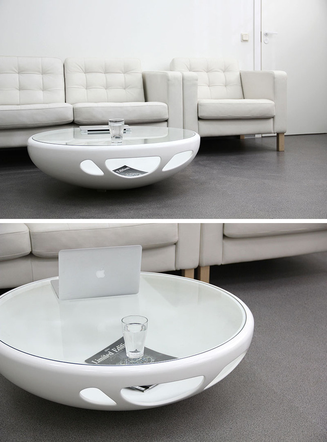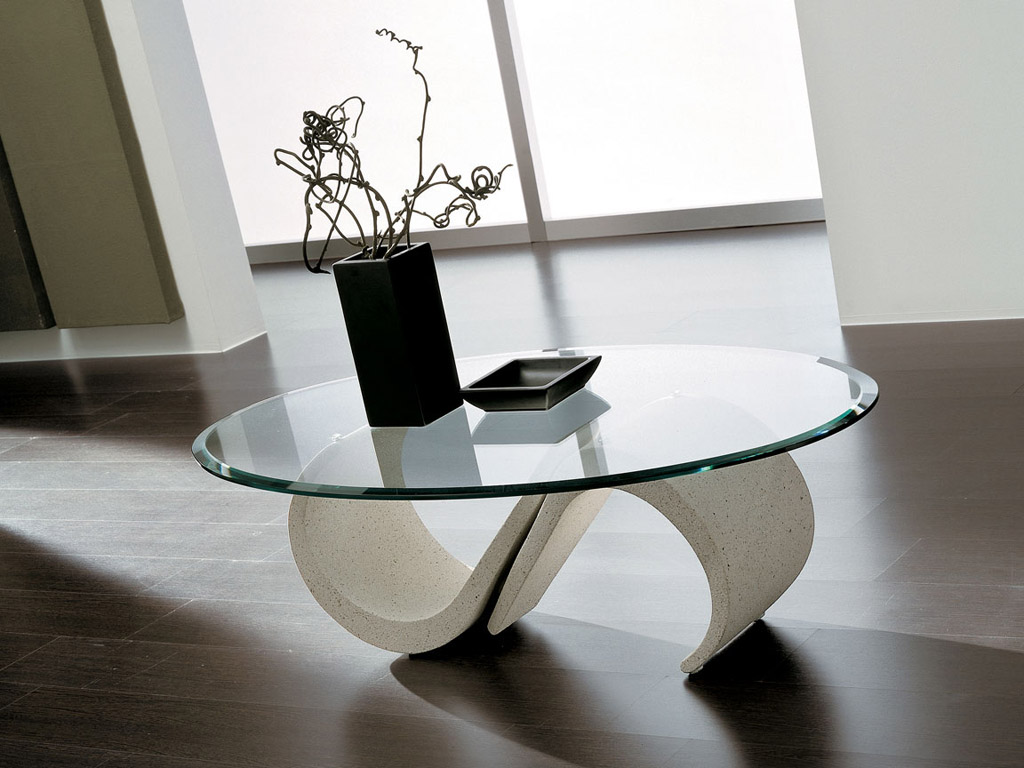 Một mẫu bàn trà kính hiện đại với xu hướng mới lạ, độc đáo khiến cho người dùng cảm thấy thích thú, khi bên dưới lớp kính chính là hình đáy vòm tạo cảm giác mềm mại nhưng cũng không kém phần chắc chắn. Ngoài ra, phần bên dưới còn có khoảng trống tiện dụng cho việc cất giữ đồ đạc.