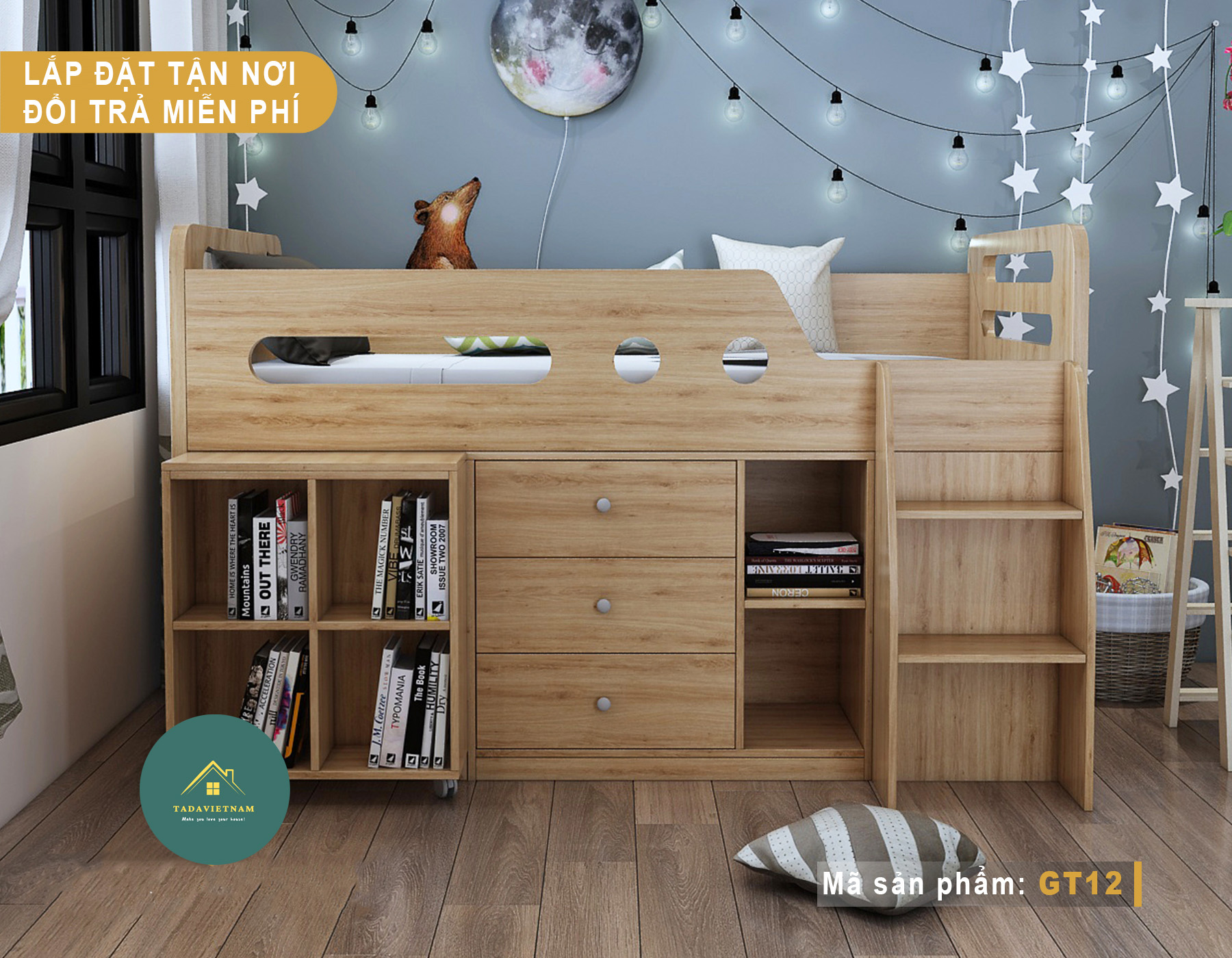 >> Giường tầng đa năng cho trẻ kết hợp kệ sách và bậc thang đi lên tiện ích - GT15