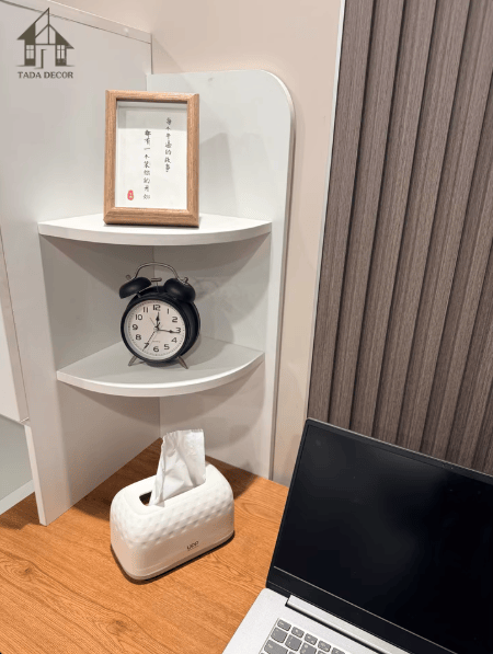 Bên cạnh đó, phần kệ dưới bàn và kệ góc được bố trí thêm giúp tận dụng không gian rất tốt. Những vật dụng ít dùng hơn có thể để phía dưới, vừa gọn gàng vừa không chiếm diện tích mặt bàn. Điều này đặc biệt hữu ích với những ai có thói quen bày nhiều đồ khi học hoặc làm việc.