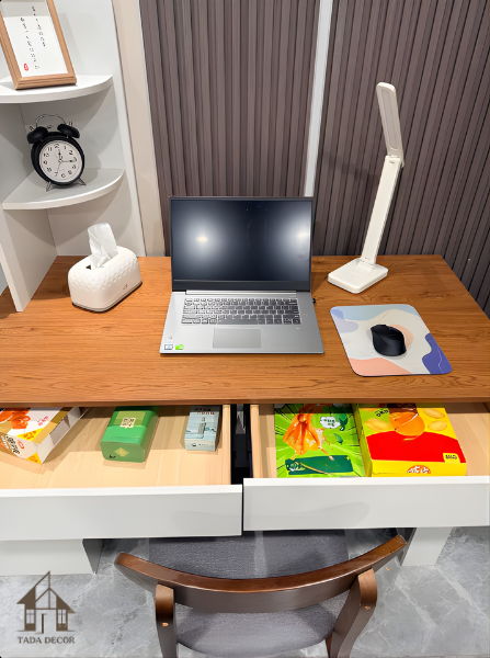 Phần ngăn kéo được thiết kế rộng, chia thành nhiều khoang, giúp người dùng dễ dàng sắp xếp các vật dụng nhỏ như bút, giấy, sạc, tai nghe… mà không bị lộn xộn. Khi kéo ra, cảm giác trượt khá mượt, không bị kẹt hay nặng tay – một chi tiết nhỏ nhưng dùng lâu sẽ thấy rất khác biệt.