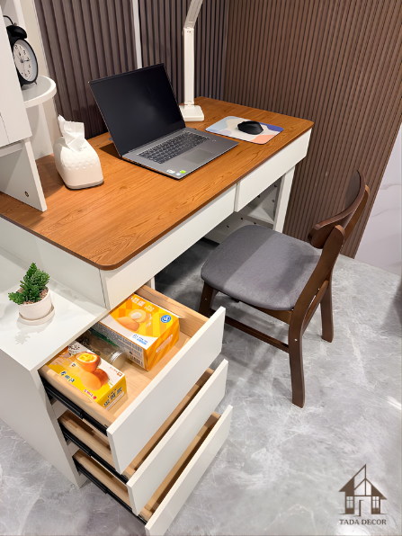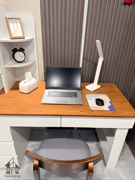Mặt bàn sử dụng tone màu gỗ ấm, kết hợp với phần thân trắng tạo sự cân bằng rất dễ chịu cho mắt. Khi đặt vào không gian, nó không bị quá nổi nhưng cũng không hề “chìm”. Kiểu thiết kế này đặc biệt phù hợp với những ai thích sự nhẹ nhàng, sạch sẽ và dễ chịu trong không gian học tập.