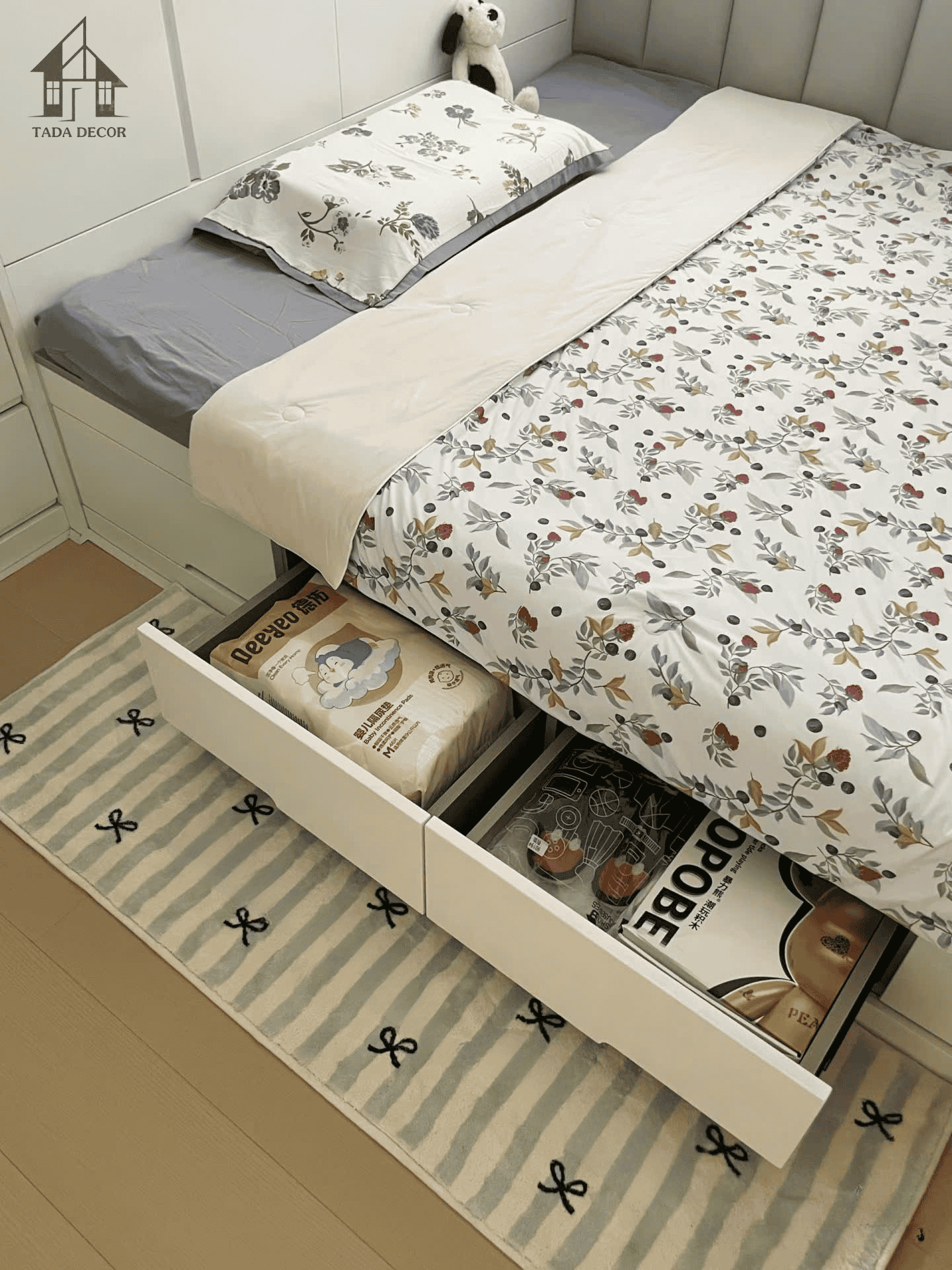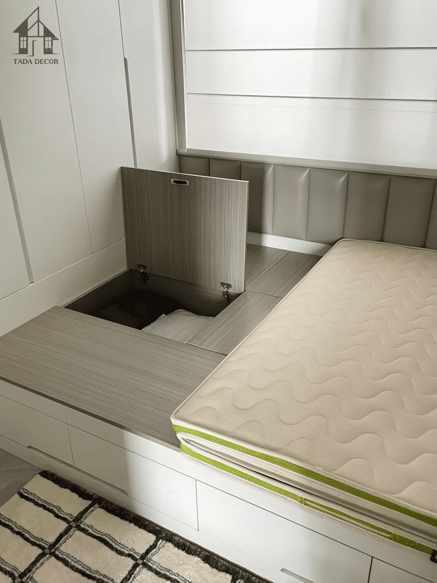 Phần giường được thiết kế dạng bệt, chắc chắn, bên dưới tích hợp ngăn kéo và khoang chứa đồ cực kỳ tiện. Những món đồ ít dùng như chăn mùa đông, vali hay đồ dự phòng đều có thể cất gọn bên trong, giúp phòng luôn thoáng.