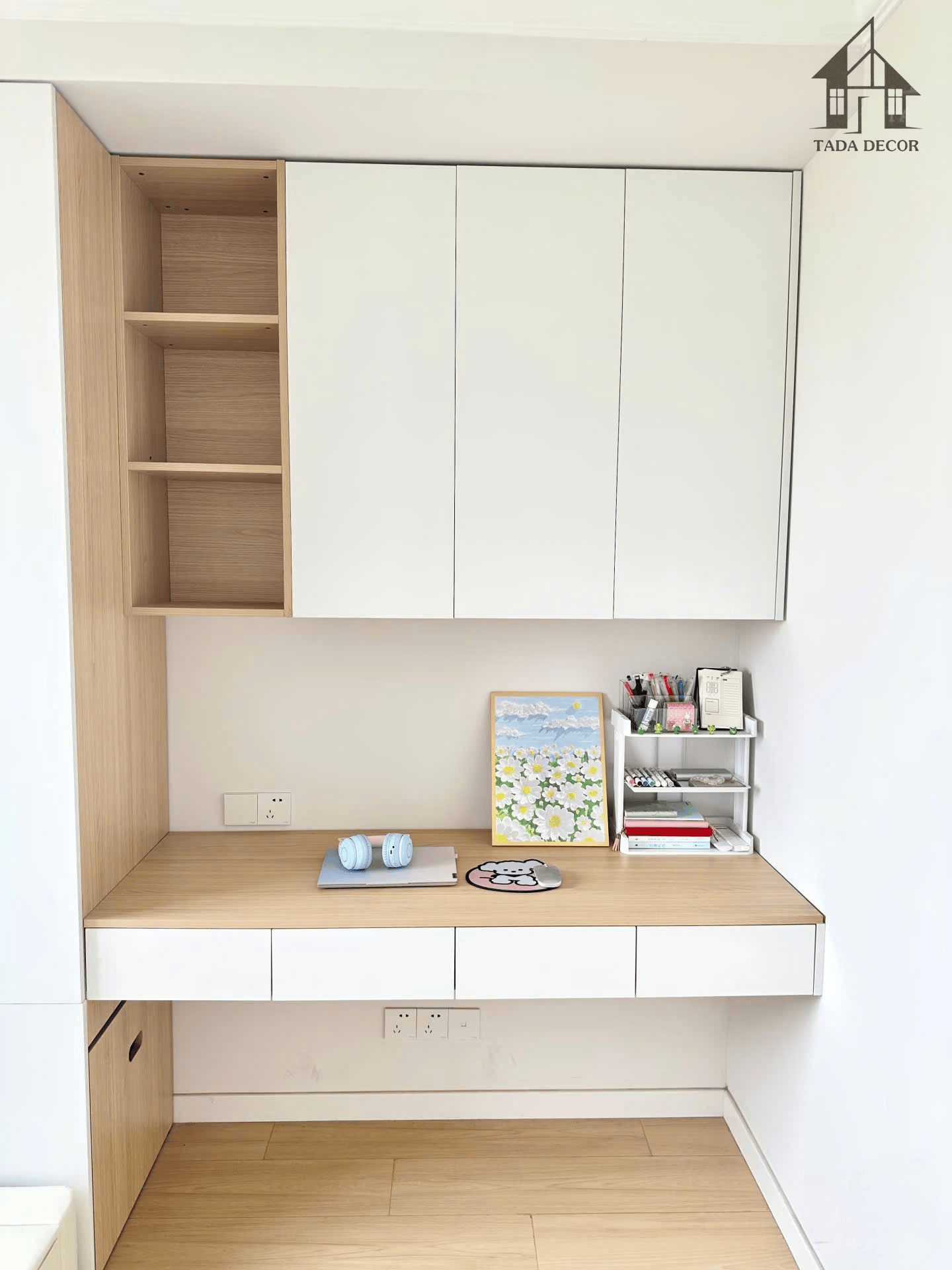 Phần bàn được thiết kế chạy ngang theo tường, đủ rộng để đặt laptop, sách, đồ dùng học tập hay làm việc hằng ngày. Bên trên là hệ tủ treo cánh kín kết hợp với các hộc mở. Đây là cách tổ chức rất hợp lý, vì những món cần giấu đi có thể đưa vào khoang kín, trong khi sách, đồ decor hay vật dụng lấy thường xuyên có thể để ở hộc mở cho tiện. Dưới bàn còn có thêm phần ngăn kéo và hộc di động, giúp tăng thêm sức chứa mà vẫn giữ tổng thể rất gọn.
