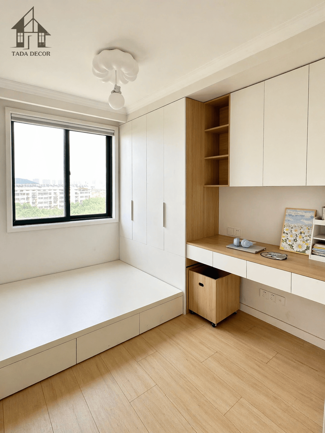 Với những ai đang tìm combo phòng ngủ tiện lợi, đây là một cấu trúc rất đáng để cân nhắc. Nó không chỉ tạo ra một góc ngủ đẹp mà còn hình thành một góc học tập hoặc làm việc chỉn chu ngay trong cùng không gian. TADA cho rằng đây là kiểu thiết kế rất hợp với học sinh, sinh viên, người trẻ sống trong căn hộ hoặc bất kỳ ai muốn căn phòng ngủ vừa là nơi nghỉ ngơi vừa là nơi tập trung làm việc nhẹ nhàng.