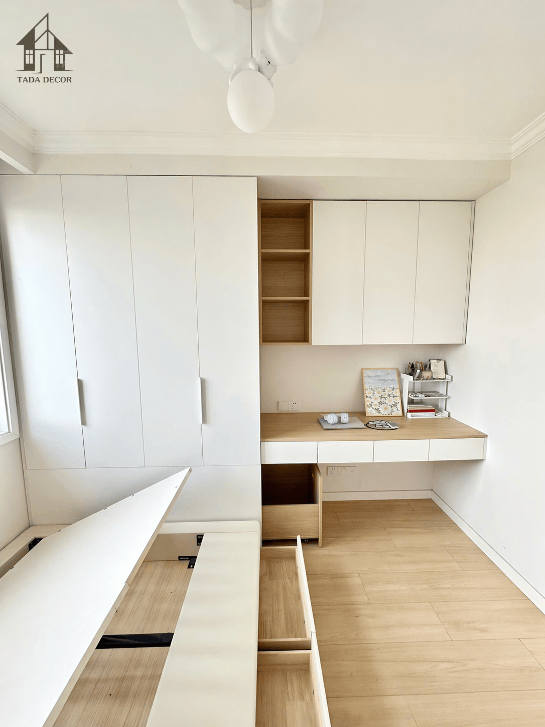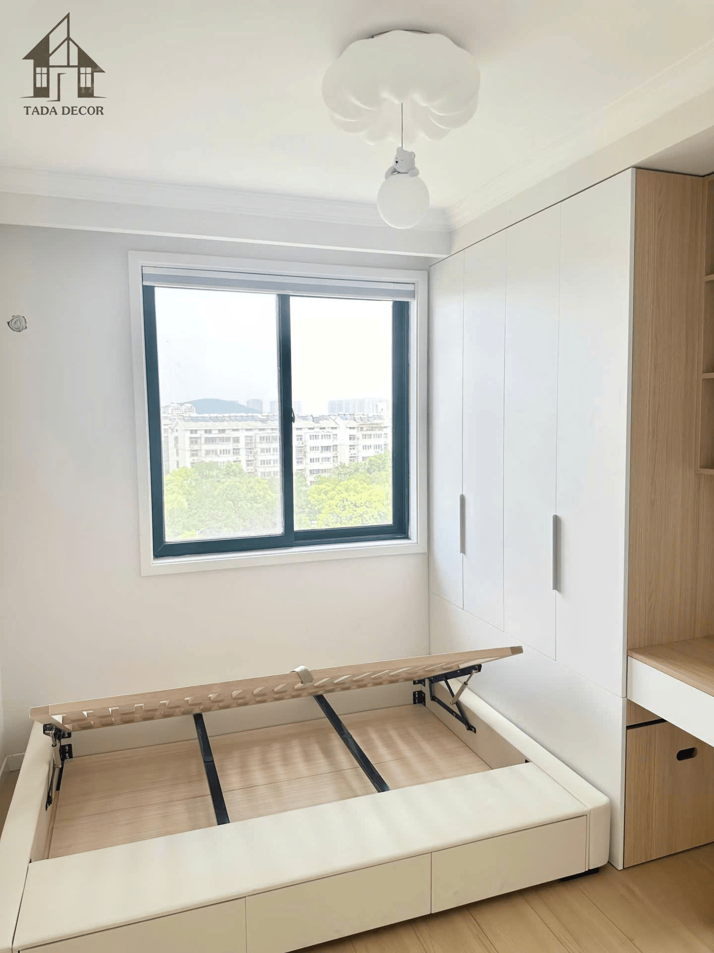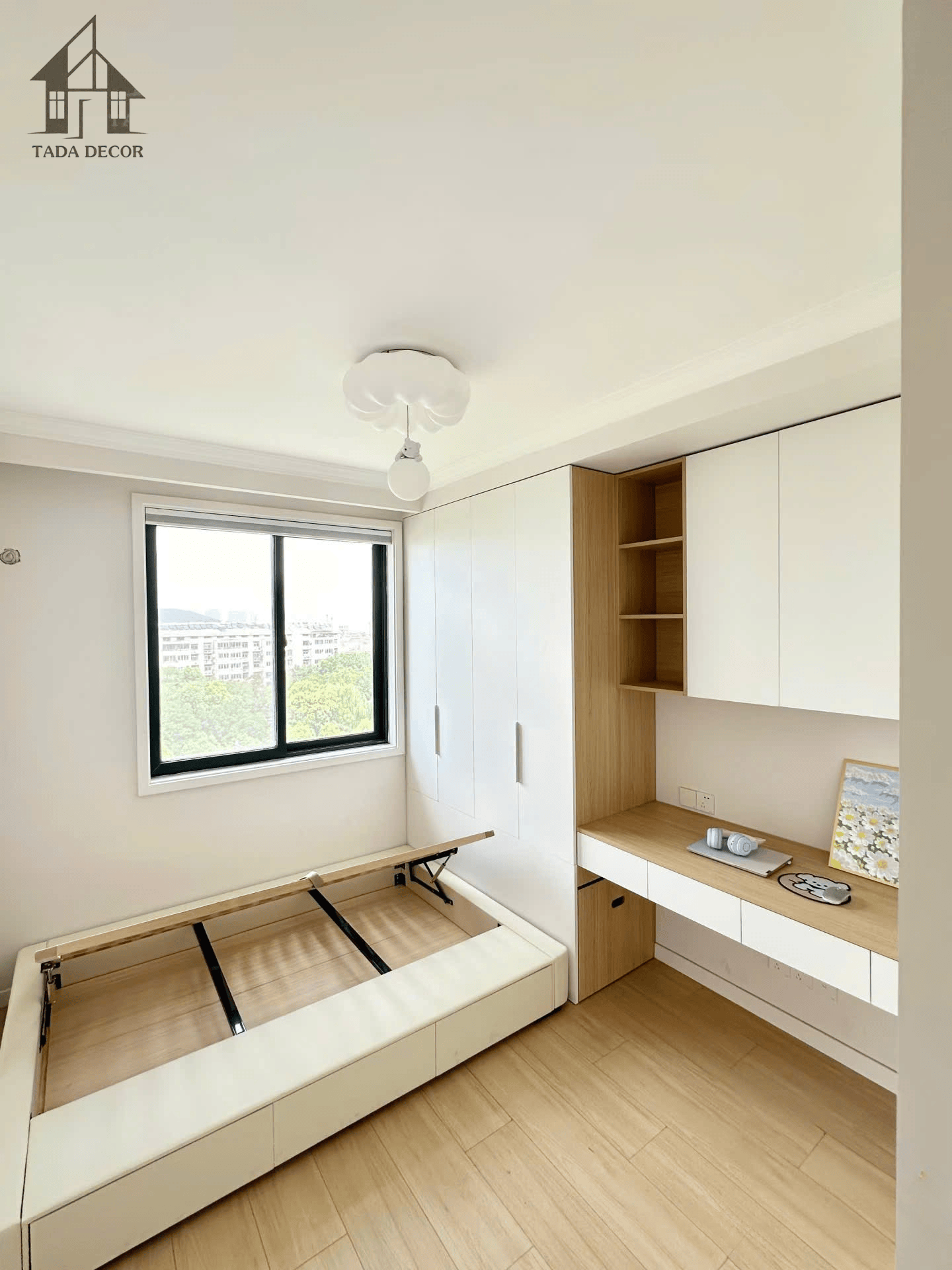 Nhiều khách hàng lo rằng nội thất tích hợp sẽ làm không gian nặng hơn. Nhưng nếu xử lý đúng, hiệu quả lại hoàn toàn ngược lại. Với mẫu này, TADA thấy phần giường liền tủ chính là yếu tố giúp phòng ngủ nhỏ trở nên hợp lý và dễ sống hơn rất nhiều.