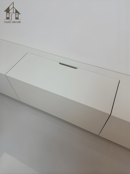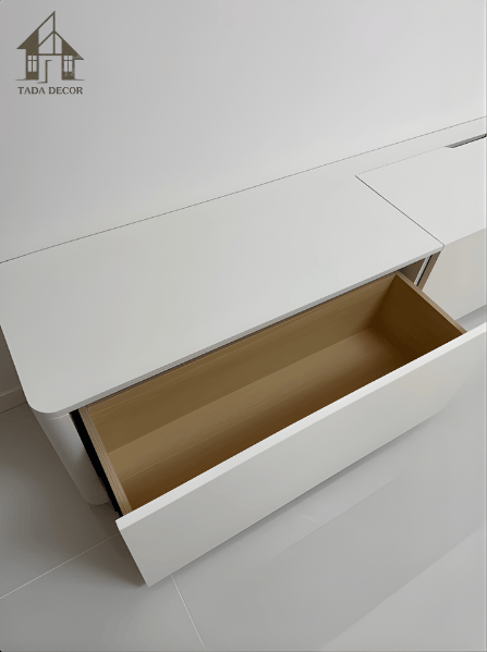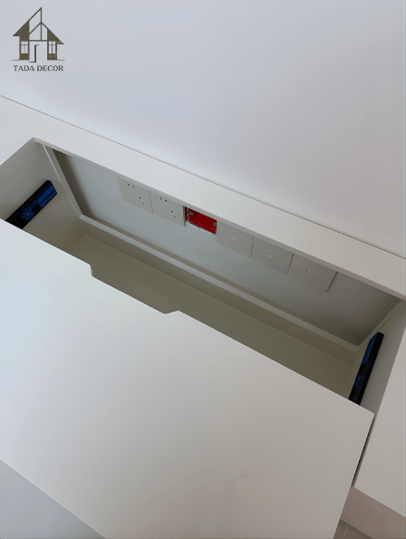 Đặc biệt, phần nắp mở phía trên được thiết kế khéo léo để che đi hệ thống ổ điện, giúp không gian luôn gọn gàng, không bị rối mắt bởi dây điện. Đây là một chi tiết nhỏ nhưng thể hiện rõ sự tinh tế trong thiết kế của TADA – luôn đặt trải nghiệm người dùng lên hàng đầu.