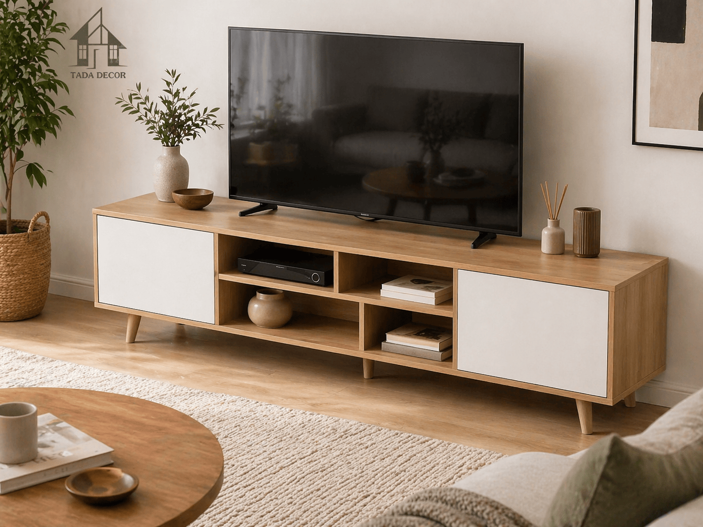 Mẫu kệ này ghi điểm ngay từ bố cục tổng thể. Phần khung gỗ sáng phối cùng các mảng cánh trắng tạo cảm giác rất sạch, rất hiện đại nhưng không hề lạnh. Đây là kiểu phối màu mà TADA cực kỳ ưa chuộng trong các không gian sống ngày nay, bởi nó dễ ứng dụng, dễ phối với sofa, bàn trà, thảm, rèm và nhiều phong cách nội thất khác nhau. Không cần quá nhiều đồ decor, bản thân chiếc kệ tivi đẹp này đã đủ làm cho góc phòng khách trông chỉn chu hơn rất nhiều. Từ hình ảnh sản phẩm, khách hàng có thể thấy rõ tinh thần mà TADA hướng đến: tối giản nhưng không đơn điệu, gọn gàng nhưng không nhàm chán, tiện dụng nhưng vẫn giữ được chất thẩm mỹ.