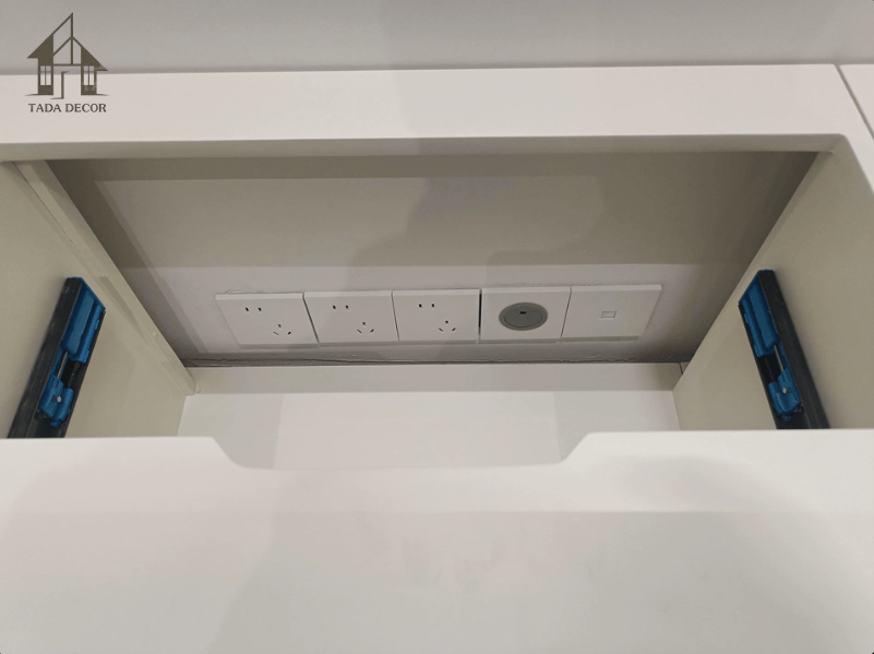 Rất nhiều người đầu tư một chiếc kệ tivi đẹp nhưng lại bỏ qua việc xử lý hệ thống dây điện phía sau, dẫn đến tình trạng dây chằng chịt, rối mắt và làm giảm giá trị thẩm mỹ của toàn bộ không gian, hiểu rõ điều đó nên TADA đã thiết kế riêng khu vực đặt ổ điện âm bên trong khoang kệ, giúp toàn bộ dây nguồn, modem, đầu thu được giấu gọn một cách có kiểm soát, không cần khoan thêm tường hay đi dây lòng vòng, từ đó mang lại một tổng thể sạch sẽ, tinh tế và đúng nghĩa “gọn từ ngoài vào trong”, đây là một trong những điểm khiến khách hàng sau khi sử dụng thường đánh giá rất cao.