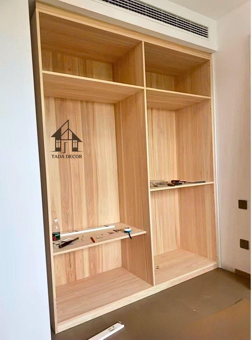 Đội ngũ kỹ thuật TADA Vietnam tiến hành đo đạc, thiết kế chi tiết và sản xuất trong thời gian ngắn. Toàn bộ tủ được gia công từ gỗ công nghiệp cao cấp, chống cong vênh, chống ẩm mốc, kết hợp bản lề giảm chấn giúp việc đóng mở êm ái. Quá trình lắp đặt tại nhà diễn ra nhanh chóng, gọn gàng và đảm bảo đúng tiến độ bàn giao.