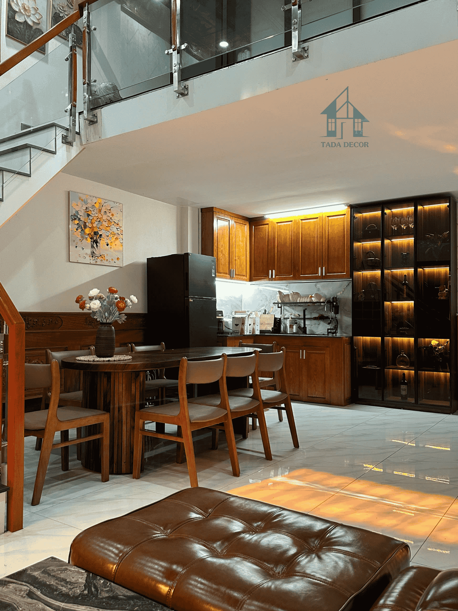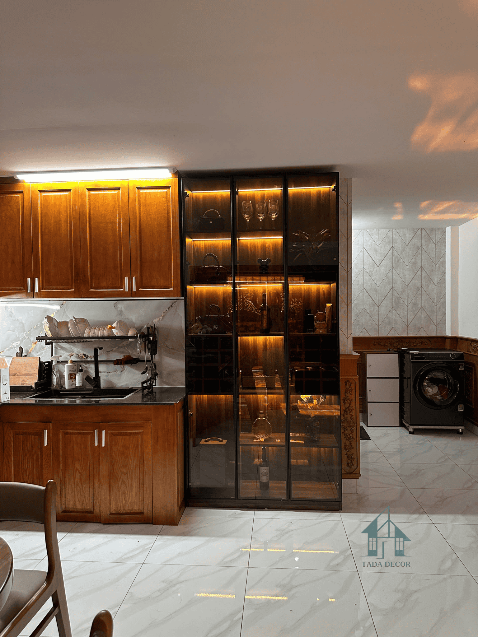 Sau khi hoàn thiện thi công, mẫu tủ kính trưng bày đã được lắp đặt trực tiếp tại khu vực phòng bếp và phòng ăn của khách hàng. Nhờ thiết kế cao sát trần và hệ thống kính trong suốt, chiếc tủ kính trưng bày phòng khách trở thành điểm nhấn nổi bật trong toàn bộ không gian sinh hoạt của gia đình. Tủ được đặt cạnh khu vực bếp, giúp gia chủ vừa có thể trưng bày các chai rượu, ly rượu và đồ decor vừa tạo nên một góc bar mini nhỏ gọn ngay trong nhà. Với ánh sáng đèn LED vàng ấm bên trong, toàn bộ khu vực tủ trưng bày kính trở nên sang trọng và thu hút hơn, đặc biệt khi bật đèn vào buổi tối.