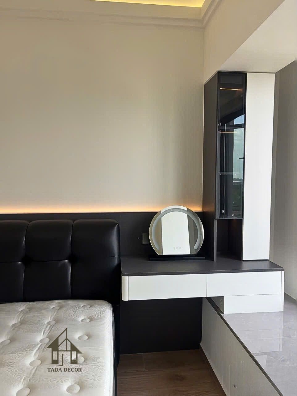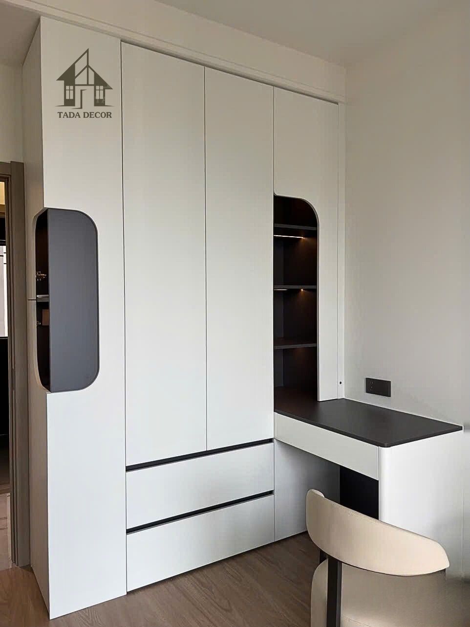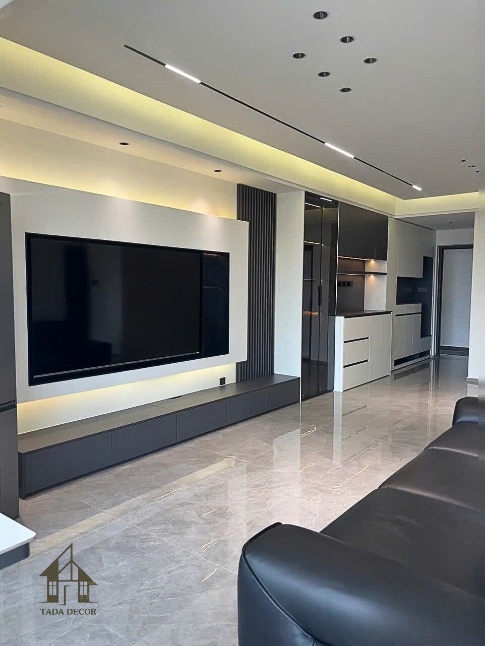 Sau khi thống nhất bản thiết kế 3D, Tada tiến hành thi công trọn gói với phong cách nội thất hiện đại làm chủ đạo, sử dụng chất liệu gỗ MDF chống ẩm phủ melamine cao cấp, đảm bảo độ bền và tính thẩm mỹ vượt trội.