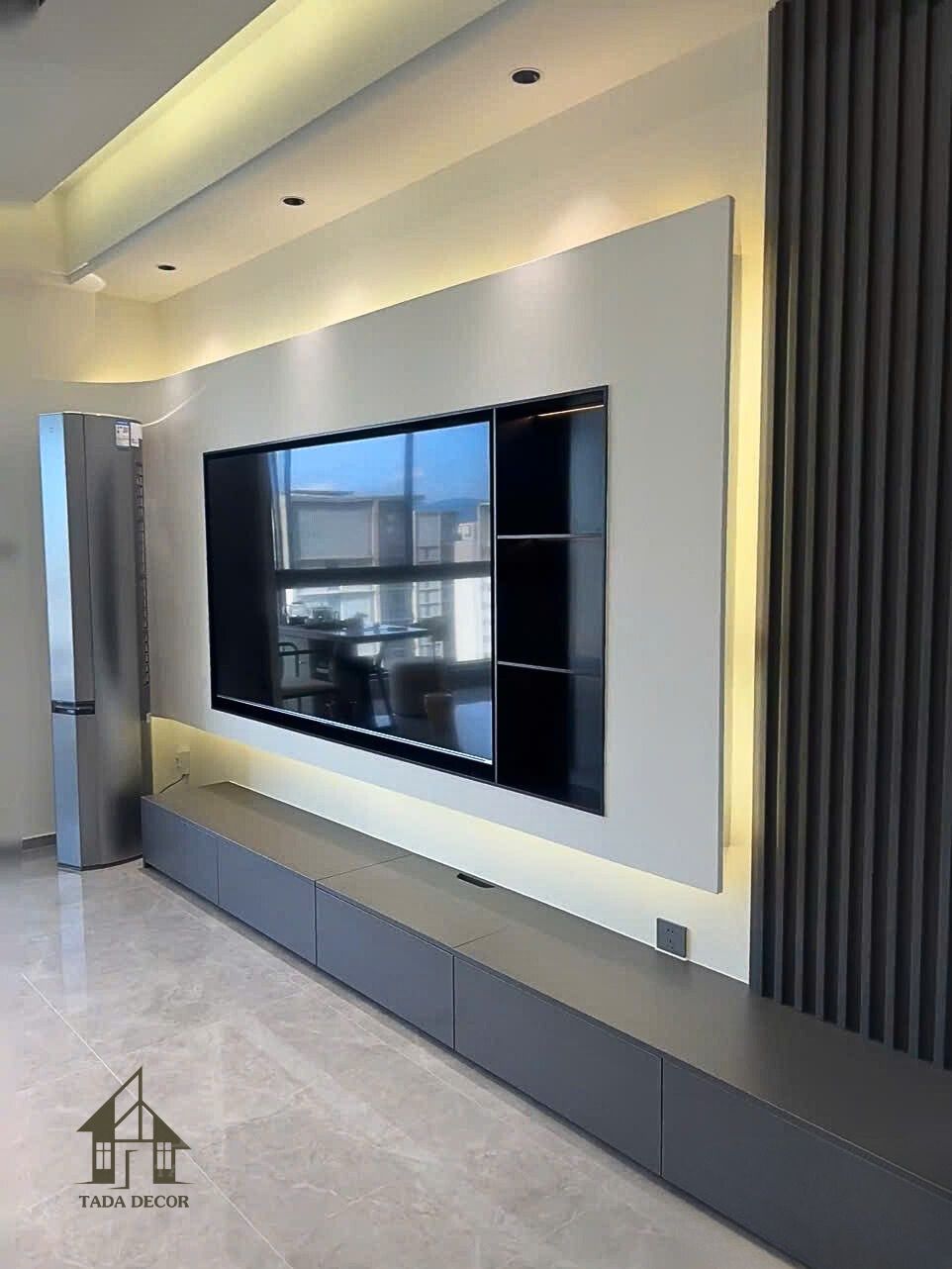 Nhờ thiết kế thông minh, kệ vừa là nơi đặt tivi vừa có ngăn chứa đồ, giữ cho không gian luôn gọn gàng và tinh tế.