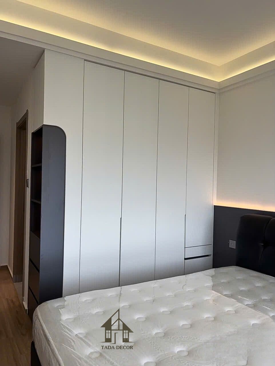 Không gian nghỉ ngơi của vợ chồng anh Nam được thiết kế theo tông nâu – trắng chủ đạo, tạo cảm giác ấm cúng nhưng vẫn sang trọng. Điểm nhấn của căn phòng là tủ quần áo hiện đại chữ L cánh kính – mẫu TQA8050 do Tada sản xuất và lắp đặt trực tiếp.
