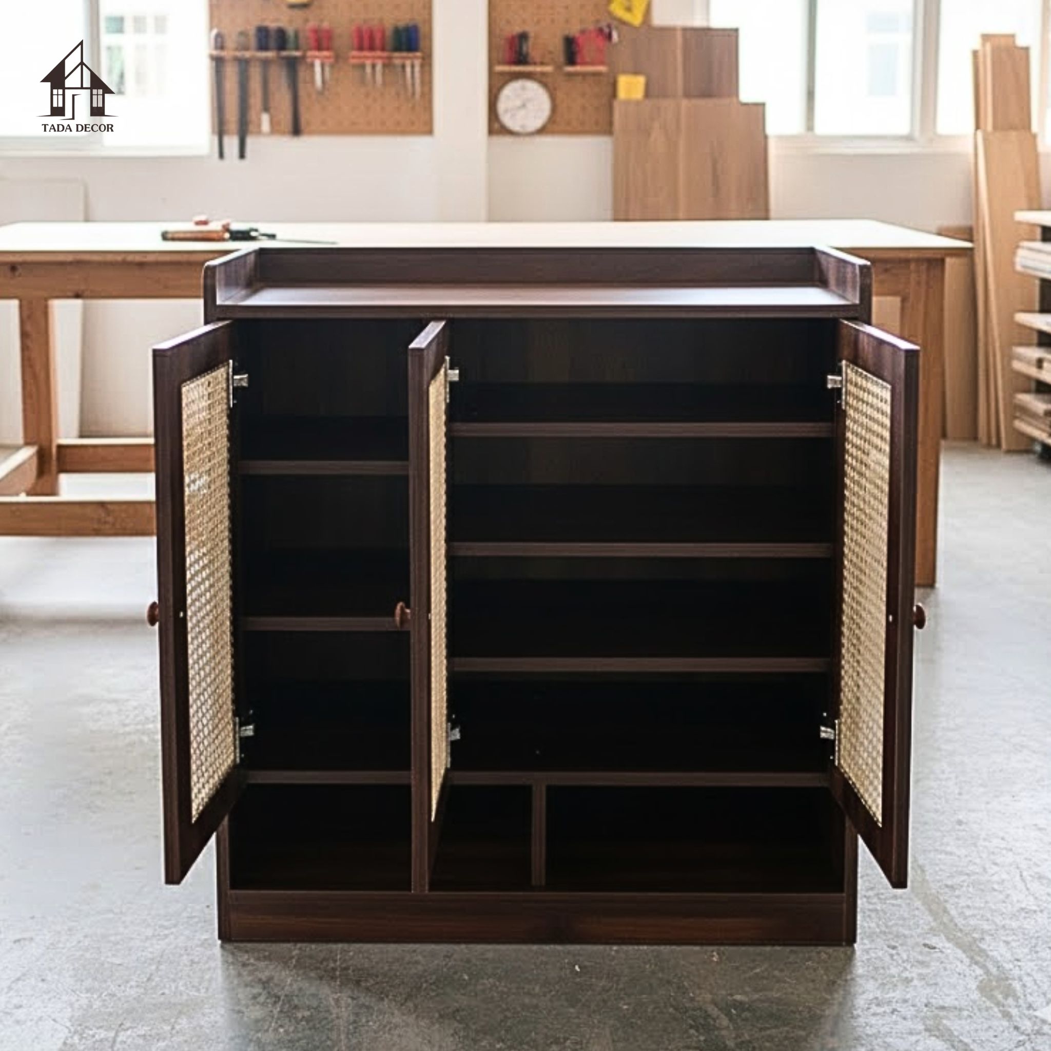 Mẫu tủ giày dép hiện đại bằng gỗ nan mây hình thực tế