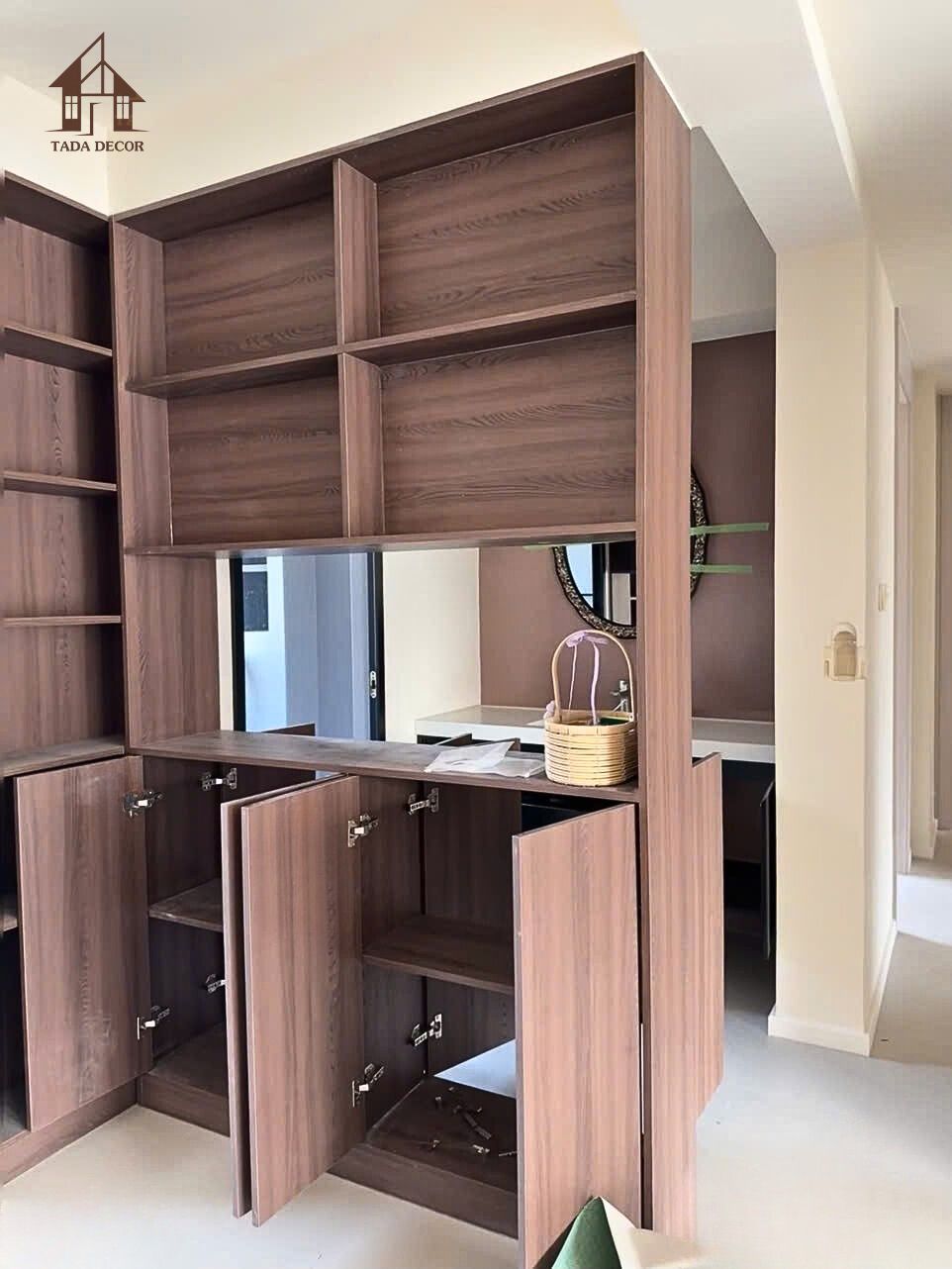 Sản phẩm được thi công bằng chất liệu MDF phủ Melamine màu óc chó, mang đến vẻ sang trọng, hiện đại nhưng vẫn ấm cúng – rất phù hợp với phong cách nội thất tổng thể của căn hộ.