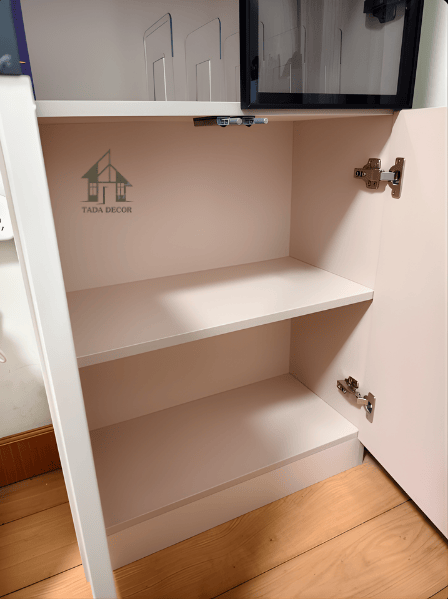 Ngoài yếu tố ổn định, lớp phủ melamine còn mang lại lợi thế rõ rệt về thẩm mỹ. Bề mặt tủ nhìn đều màu, gọn, hiện đại và dễ vệ sinh hơn trong quá trình sử dụng. Đây là điều rất đáng giá đối với một sản phẩm như tủ kệ trưng bày, bởi nhóm sản phẩm này không chỉ để cất đồ mà còn đóng vai trò thẩm mỹ trong không gian. Một bề mặt đẹp, sạch và sáng sẽ giúp toàn bộ góc đặt tủ nhìn chỉn chu hơn. TADA lựa chọn cách hoàn thiện vừa đủ để chiếc tủ giữ được vẻ thanh lịch, không quá phô trương nhưng vẫn tạo được cảm giác cao cấp.