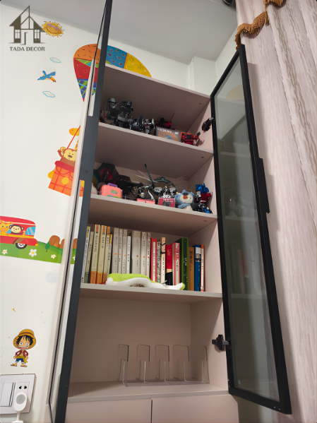 Với người yêu sách, tủ lại trở thành một góc lưu trữ nhỏ xinh. Những quyển sách đang đọc, sách yêu thích hoặc sách muốn bày đẹp đều có thể được sắp xếp gọn gàng trên các đợt tủ. Nhờ có cánh kính, góc sách sẽ nhìn sạch hơn và có chiều sâu hơn, nhất là khi đi cùng những món decor nhỏ. Với gia đình có trẻ nhỏ, chiếc tủ này cũng có thể dùng như một tủ trưng bày nhỏ cho đồ chơi đẹp, sách truyện, vật phẩm lưu niệm hoặc các món đồ cần phân loại gọn gàng.