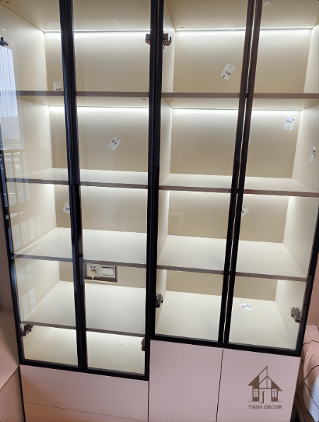 Điểm đặc biệt của mẫu tủ này nằm ở cách TADA xử lý ánh sáng. Hệ đèn LED âm bên trong giúp các vật phẩm trưng bày trở nên nổi bật hơn, tạo cảm giác sang trọng và chuyên nghiệp như một showroom thu nhỏ ngay trong nhà.