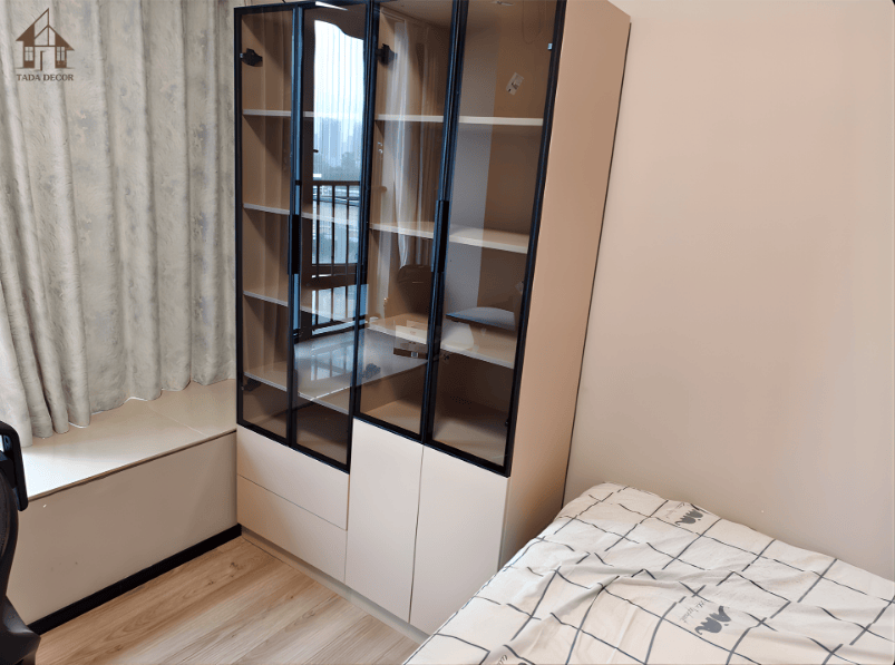 Trong phòng ngủ, tủ trưng bày giúp lưu trữ sách, đồ cá nhân và các vật phẩm nhỏ. Nhờ thiết kế kín – hở kết hợp, không gian luôn gọn gàng mà vẫn có điểm nhấn.