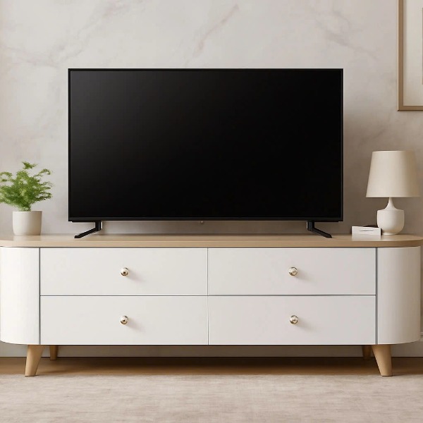 Ngoài bộ bàn ghế để ngồi, nơi đáng chú ý nhất ở căn phòng này là chiếc kệ tivi. Đây cũng chính là điểm nhấn thường thường được chú ý nhiều nhất trong phòng khách. Vì vậy khi lựa chọn kệ tivi cần lựa chọn kỹ lưỡng về hình dáng, màu sắc sao cho phù hợp với nội thất bên trong và không gian khu vực tiếp khách.