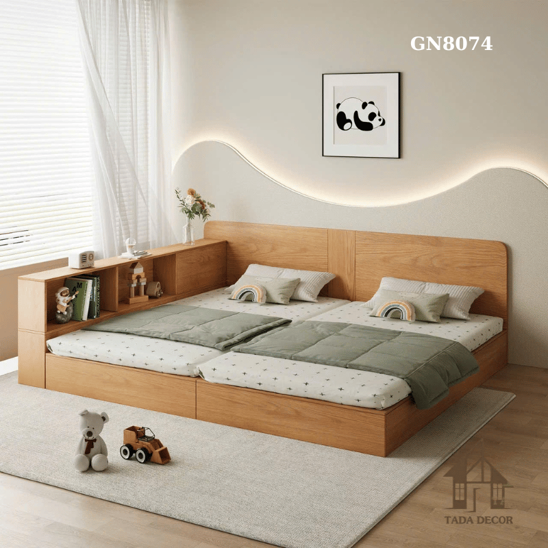Giường GNTD8074 được thiết kế theo phong cách tối giản nhưng sang trọng. Điểm nổi bật chính là phần kệ ngăn giữa – vừa đóng vai trò như vách ngăn vừa như kệ đầu giường tiện lợi. Người dùng có thể để sách, đồng hồ báo thức, bình nước hay đồ trang trí nhỏ gọn, giúp căn phòng luôn ngăn nắp.