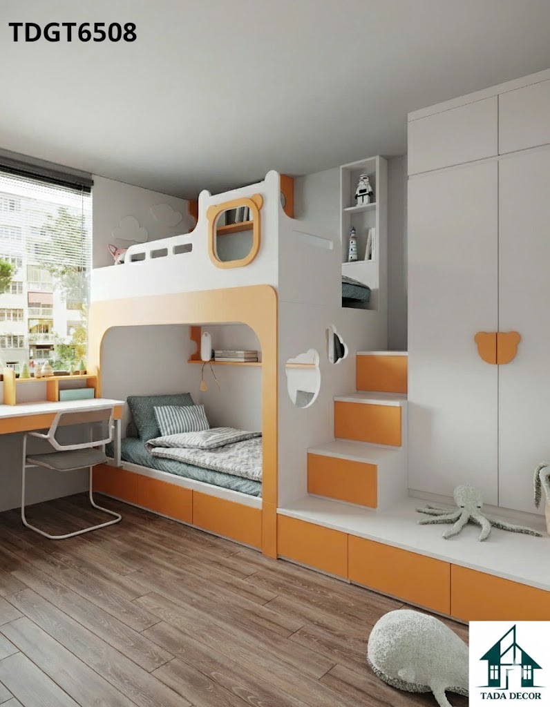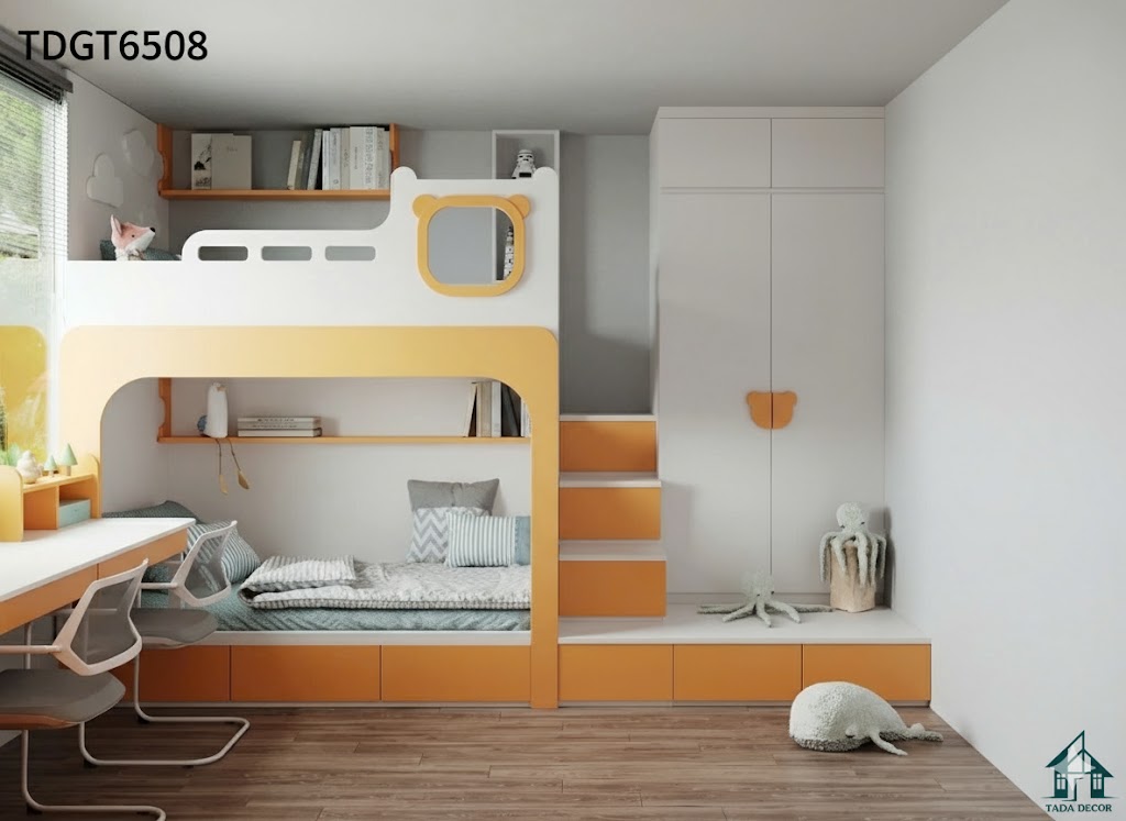 Không chỉ đơn thuần là nơi ngủ nghỉ, TDGT6508 còn tích hợp ngăn kéo chứa đồ và giá để sách tiện lợi, giúp căn phòng luôn gọn gàng. Phụ huynh có thể tận dụng phần dưới để cất đồ chơi, quần áo hoặc vật dụng học tập – cực kỳ phù hợp với những căn hộ có diện tích nhỏ.