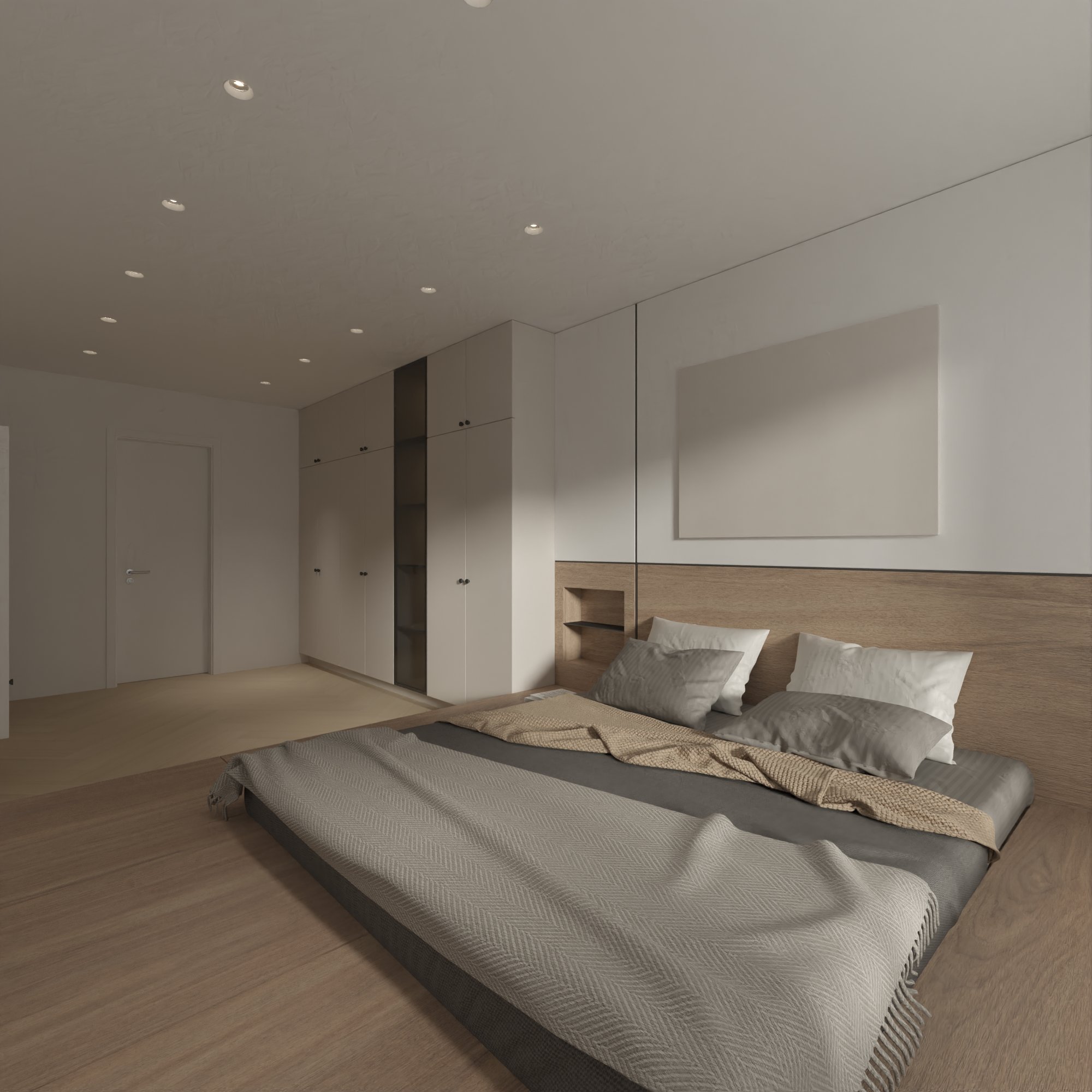 Phòng ngủ kết hợp tủ quần áo cánh trắng phù hợp với tone màu căn hộ
