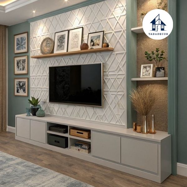 Gợi ý: Sử dụng 2-3 khung ảnh gia đình (kích thước 10x15cm) hoặc tranh nghệ thuật trừu tượng nhỏ đặt ở giữa hoặc hai bên kệ tivi.