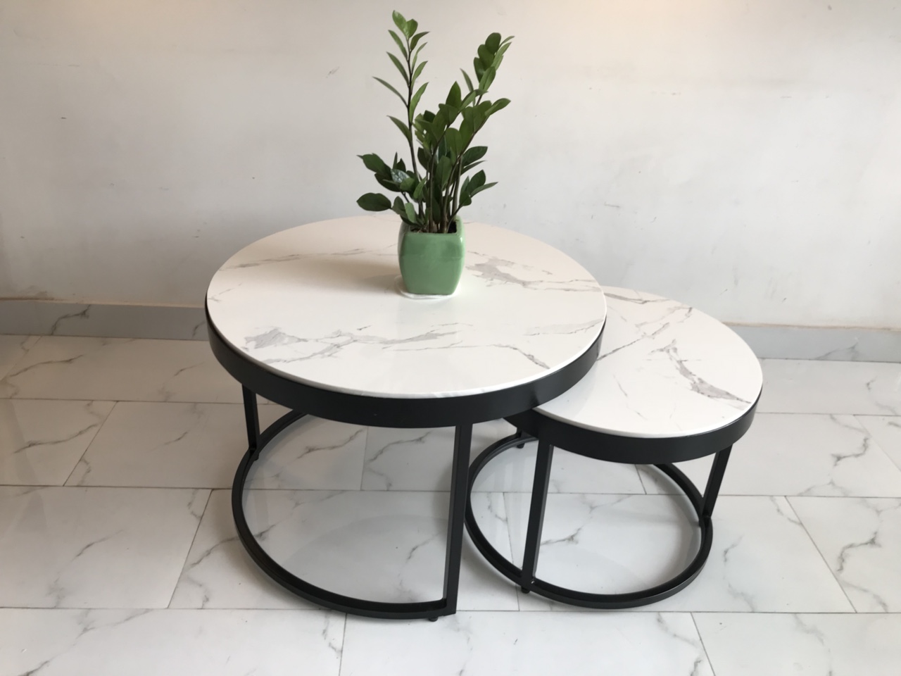 Mẫu bàn trà mặt đá khá độc đáo khi thiết kế một chiếc bàn nhỏ và một chiếc bàn to được lồng vào nhau mang đến cho gian phòng nhà bạn sự mới lạ độc đáo cũng như sự phá cách nhưng không pàm mất đi nét sang trọng vốn có.