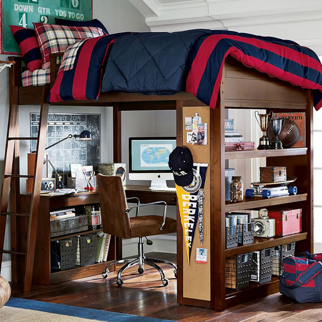 Thêm một mẫu giường ngủ kết hợp góc học tập cá tính dành cho phòng ngủ của các bé trai. Không gian học tập được thiết kế cực phong cách với các ngăn lưu trữ chiến tích của bé như cúp lưu niệm, máy vi tính cũng được trang bị để bé vừa thư giãn vừa tìm tòi kiến thức. Các vật lưu trữ hình hộp khá lạ mắt cho thấy cá tính năng động của cậu bé trai này.