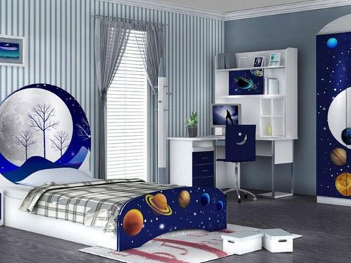 Đối với những bé nào có niềm yêu thích tới thiên nhiên vũ trụ và dải ngân hà thì đây có lẽ là một mẫu giường đẹp để các bậc cha mẹ tham khảo. Với màu sắc nhẹ nhàng cùng nhưng hình vẽ vũ trụ đầy chân thực sẽ tạo cho bé một không gian phòng ngủ đầy tính thích thú cũng như kích thích được sự sáng tạo, yêu thích bên trong con trẻ.