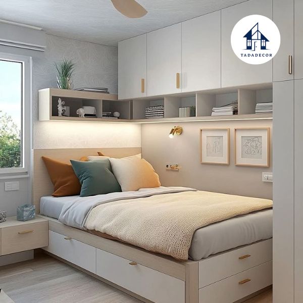 Công năng: Tích hợp tủ quần áo với ngăn kéo ẩn, kệ trang trí nhỏ gọn và không gian treo quần áo tiện lợi. Một số mẫu còn có đầu giường tích hợp kệ để đèn ngủ hoặc sách.