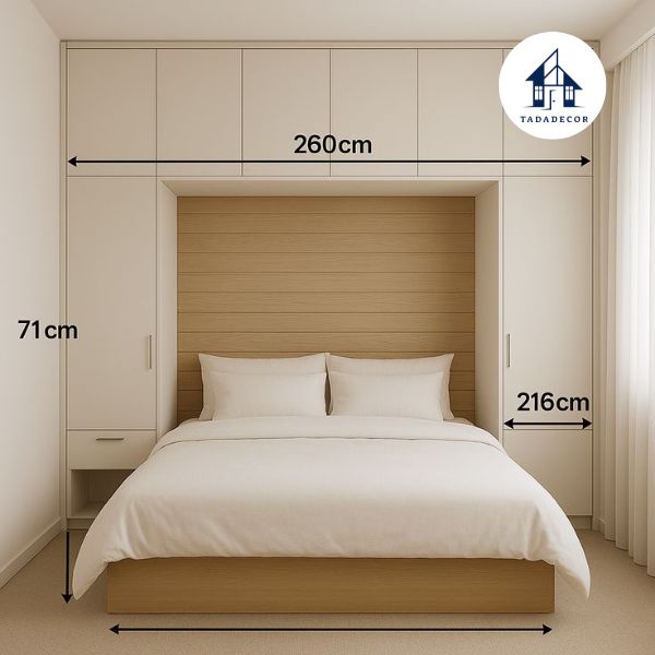 Đo đạc không gian kỹ lưỡng: Xác định kích thước phòng ngủ, vị trí đặt giường và khoảng trống cần thiết cho lối đi. Đừng quên đo chiều cao trần nhà để đảm bảo tủ tích hợp không quá cao.