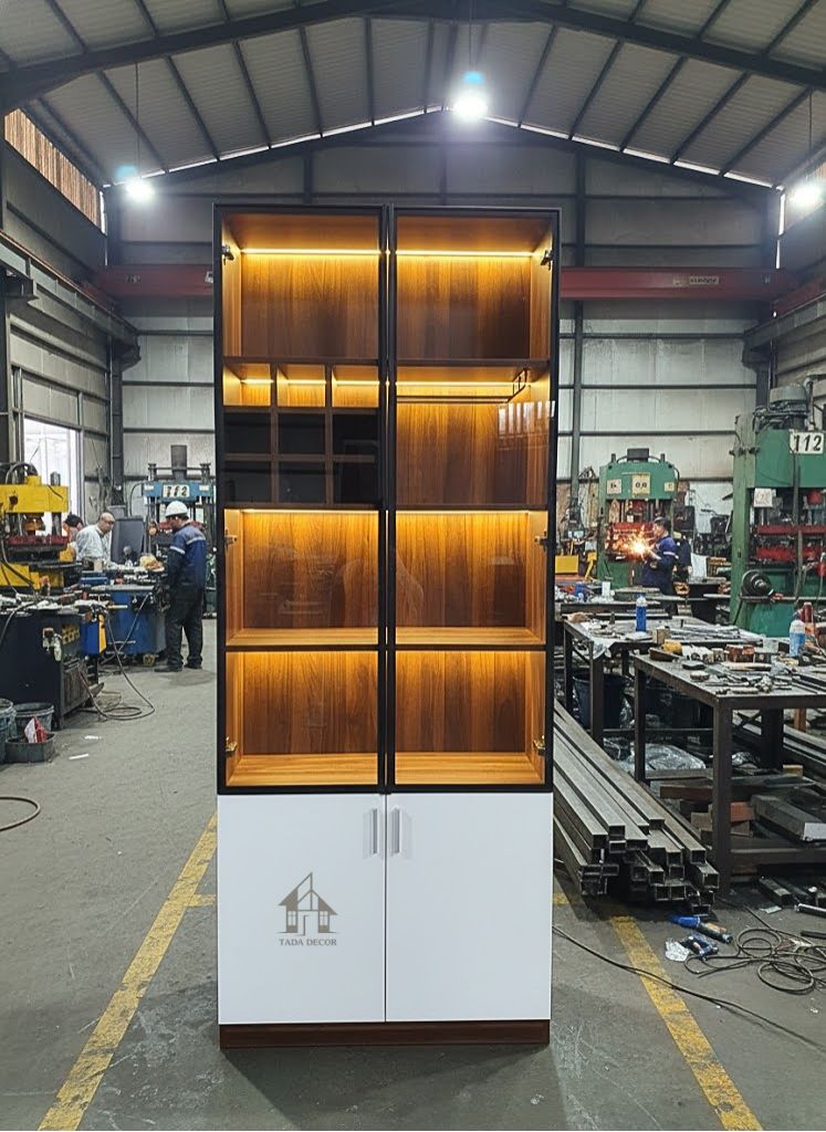 Cánh tủ sử dụng kính cường lực trong suốt, kết hợp khung kim loại sơn tĩnh điện màu đen. Ưu điểm: