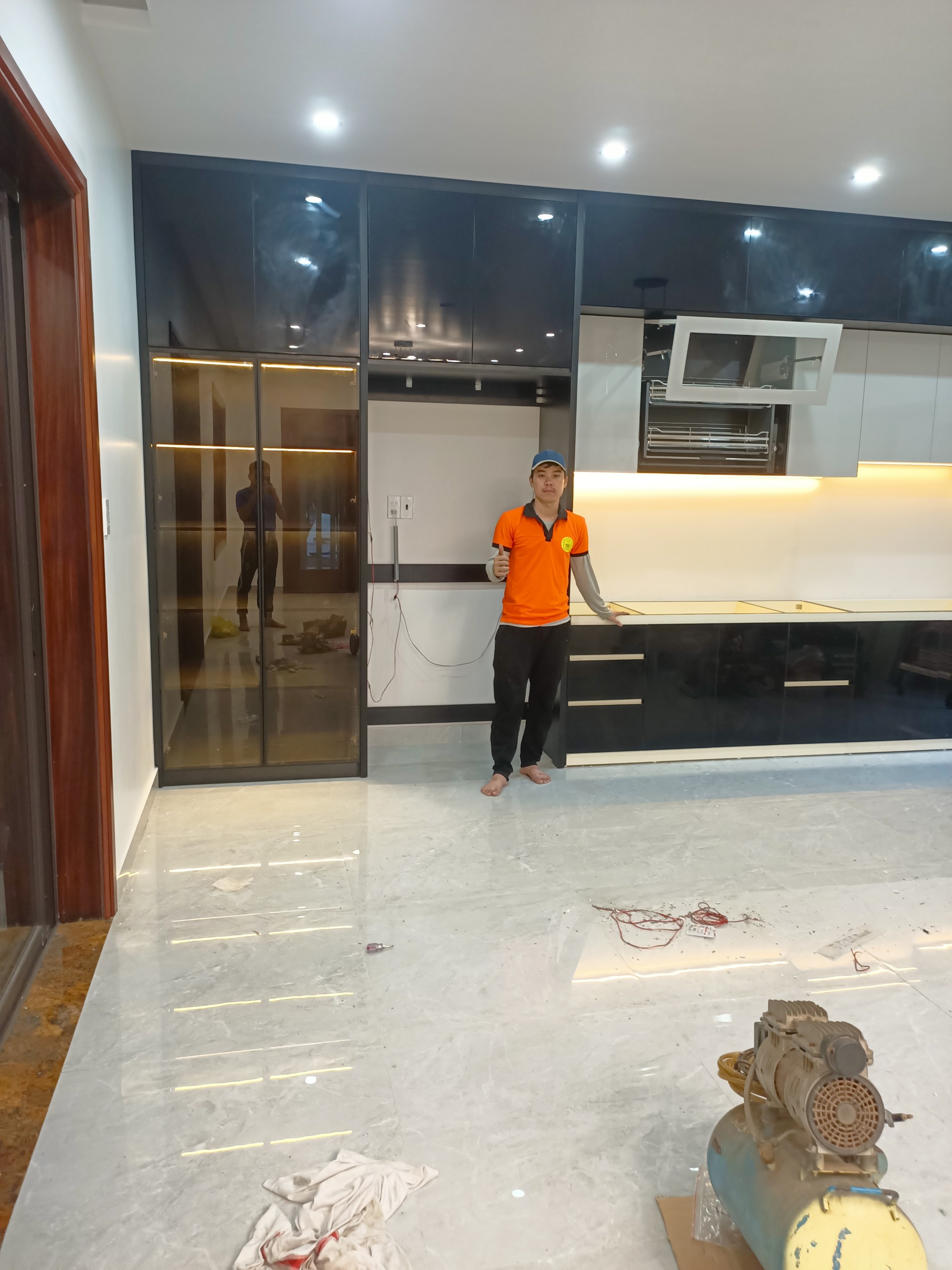 Tủ rượu khung nhôm kính cường lực sang trọng kết hợp tủ bếp chữ I kịch trần
