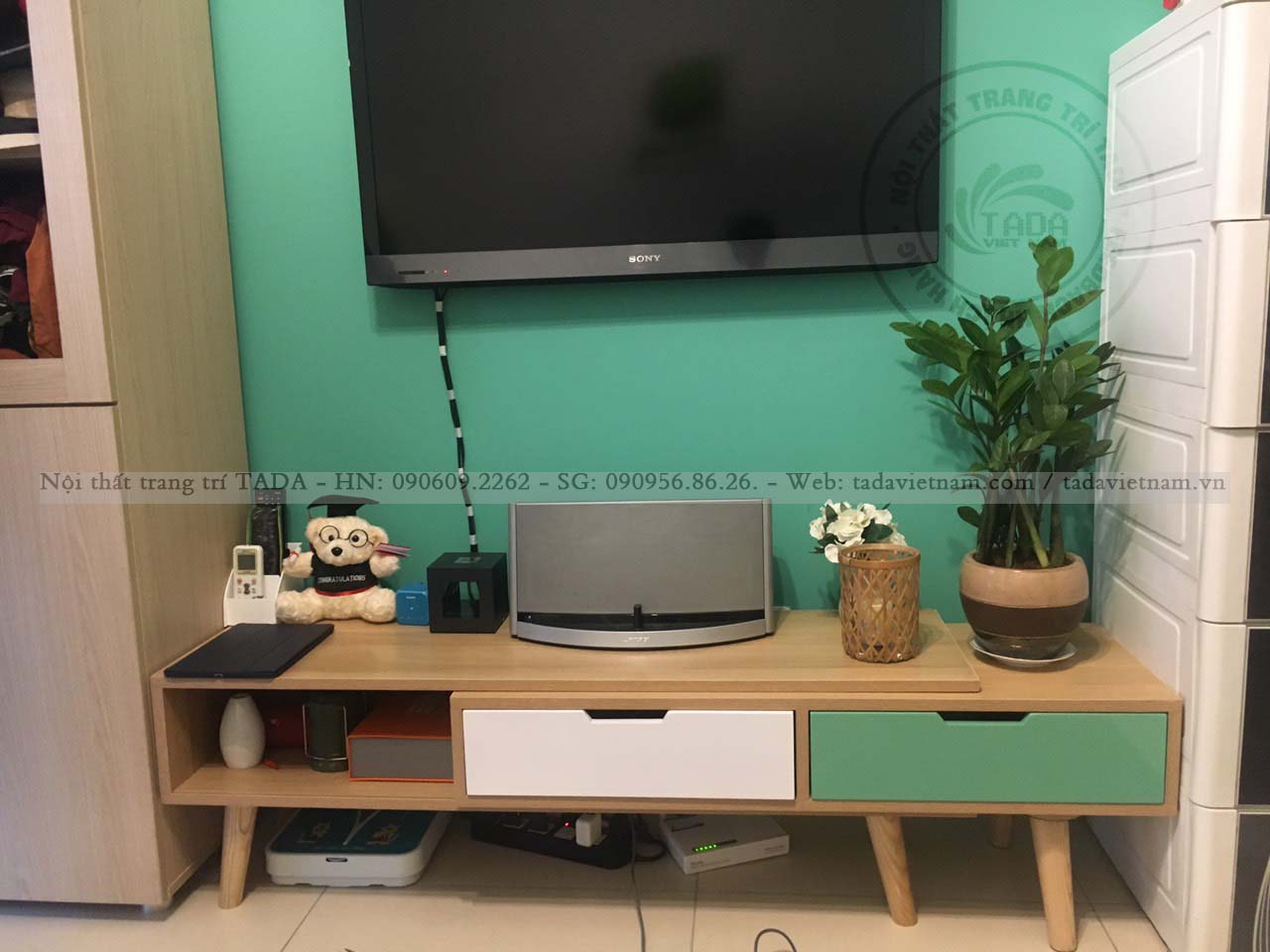 Kệ tivi để sàn chân gỗ màu sắc vân gỗ kết hợp xanh kích thước tùy chỉnh giá bán 2.980.000