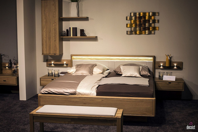 Không chỉ tường phòng khách mà ngay cả tường phòng ngủ bạn vẫn được toàn quyền sử dụng thiết kế này. Nên sắp đặt theo cách so le để các thiết kế kệ gỗ trở nên nổi bật. Bạn có thể dùng chúng như tủ lưu trữ các đồ dùng cá nhân hay đồ dùng y tế.