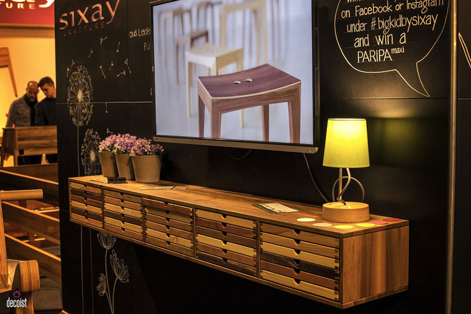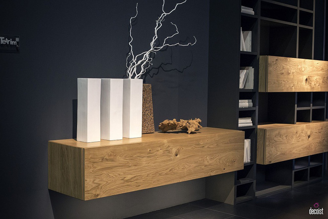 Một thiết kế kệ gỗ nổi khiến bất kỳ ai cũng phải ngẩn ngơ khi nó hoàn toàn làm bật lên được bức tường đen trông khá u ám. Phần mặt bên trên của kệ gỗ được sử dụng như một mặt bàn đặt để được các chậu hoa hay đèn bàn, … Các ngăn kéo nhỏ với phần tay cầm được thiết kế theo kiểu dáng nửa vòng cung thật sự ấn tượng lại chứa được kha khá đồ dùng cá nhân cho chủ nhà.